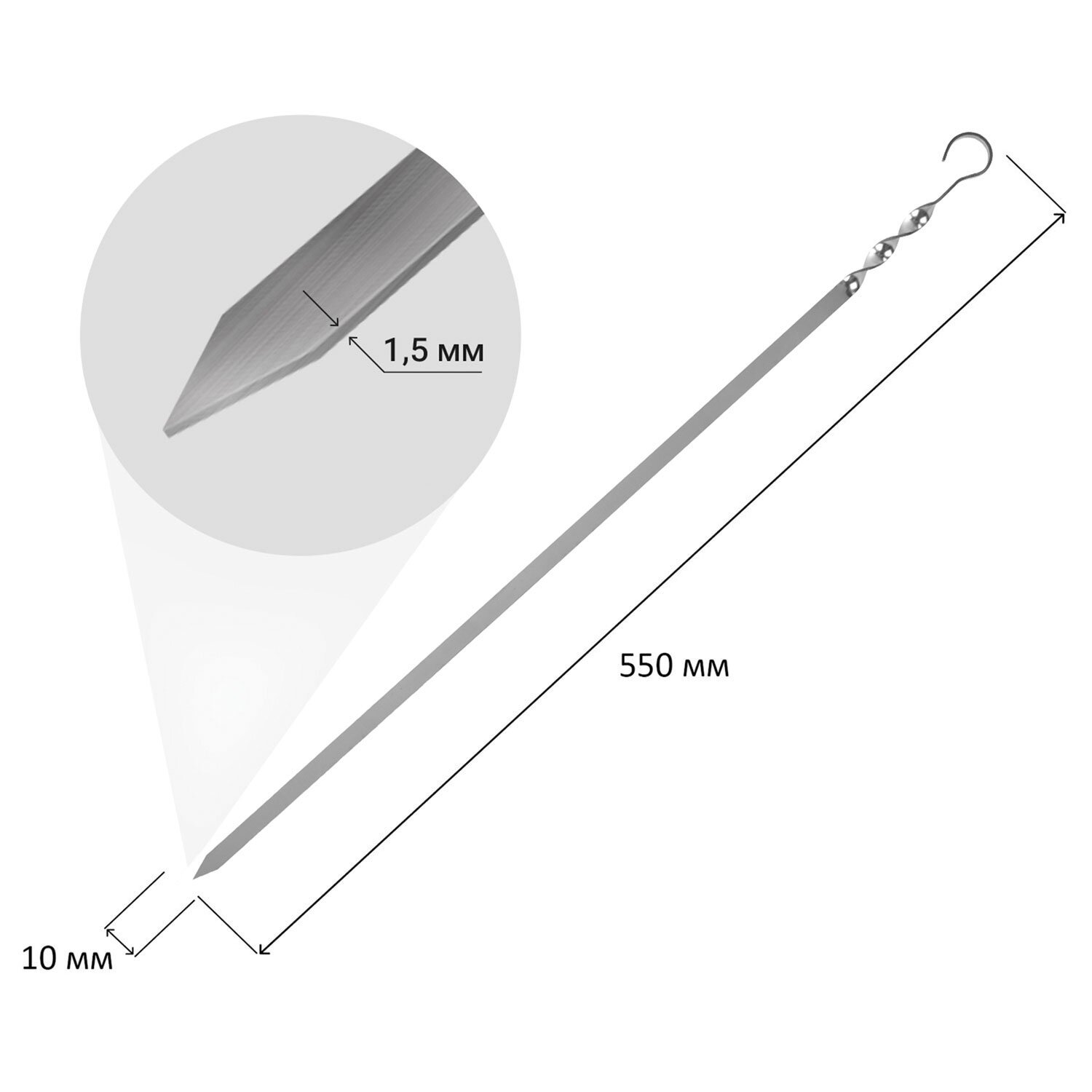 Шампур плоский, размер 550х10х1,5 мм, нержавеющая сталь, хххххх, 701736