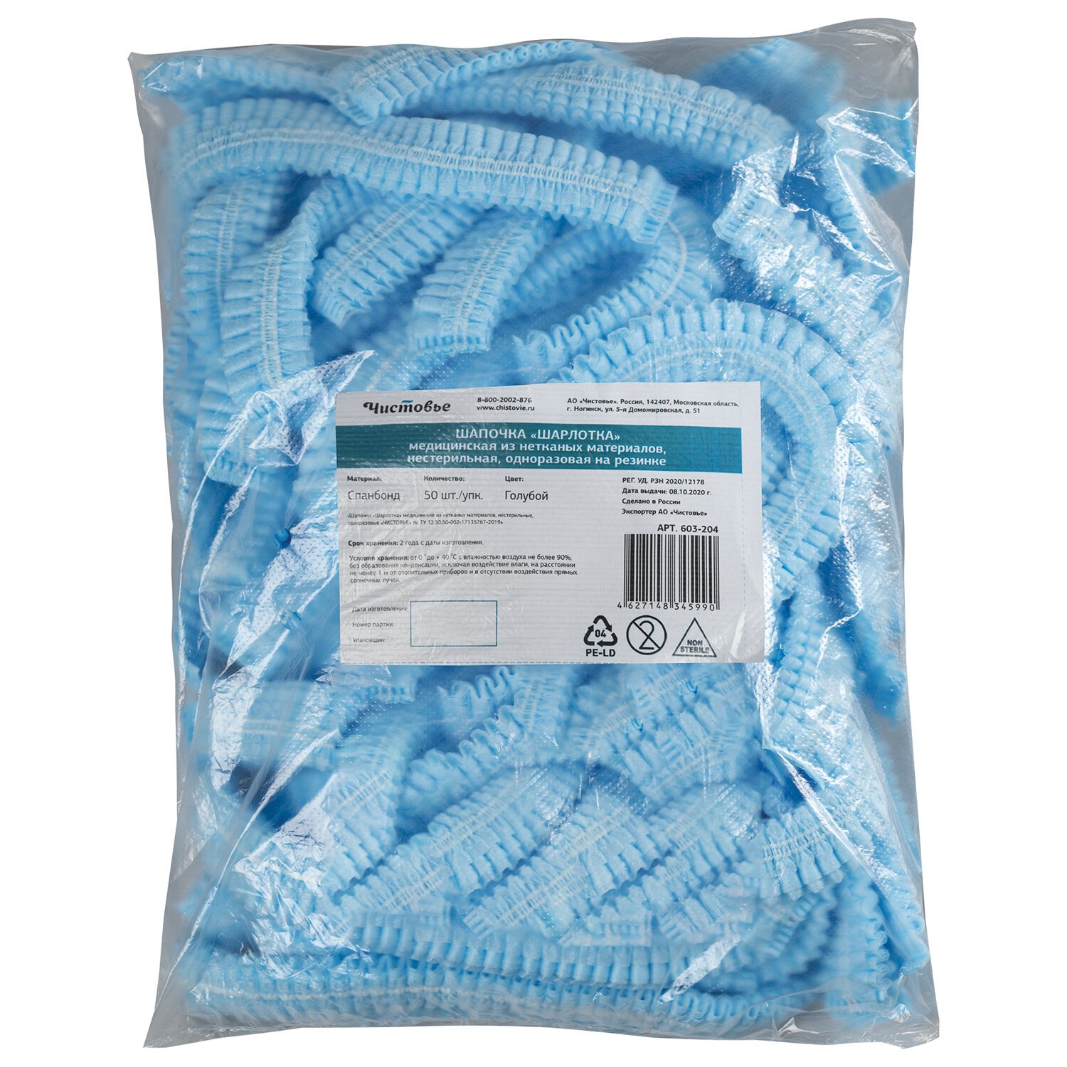 Шапочка "Шарлотта" голубая КОМПЛЕКТ 50 шт. спанбонд 15 г/м2, ЧИСТОВЬЕ, 603-204