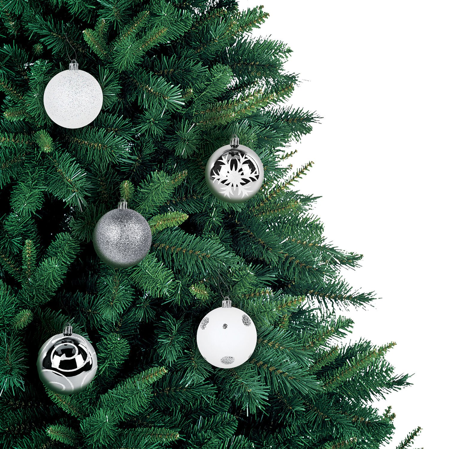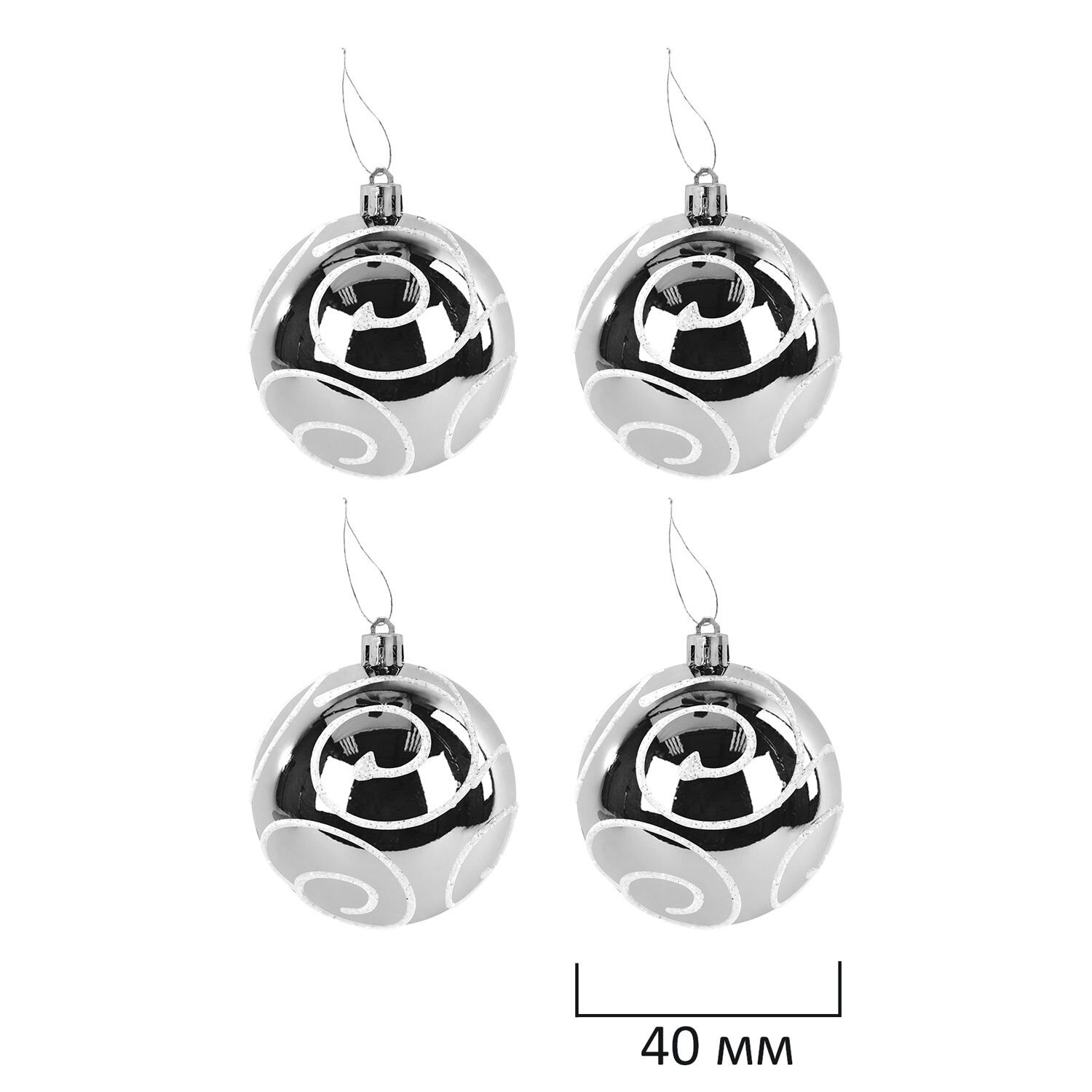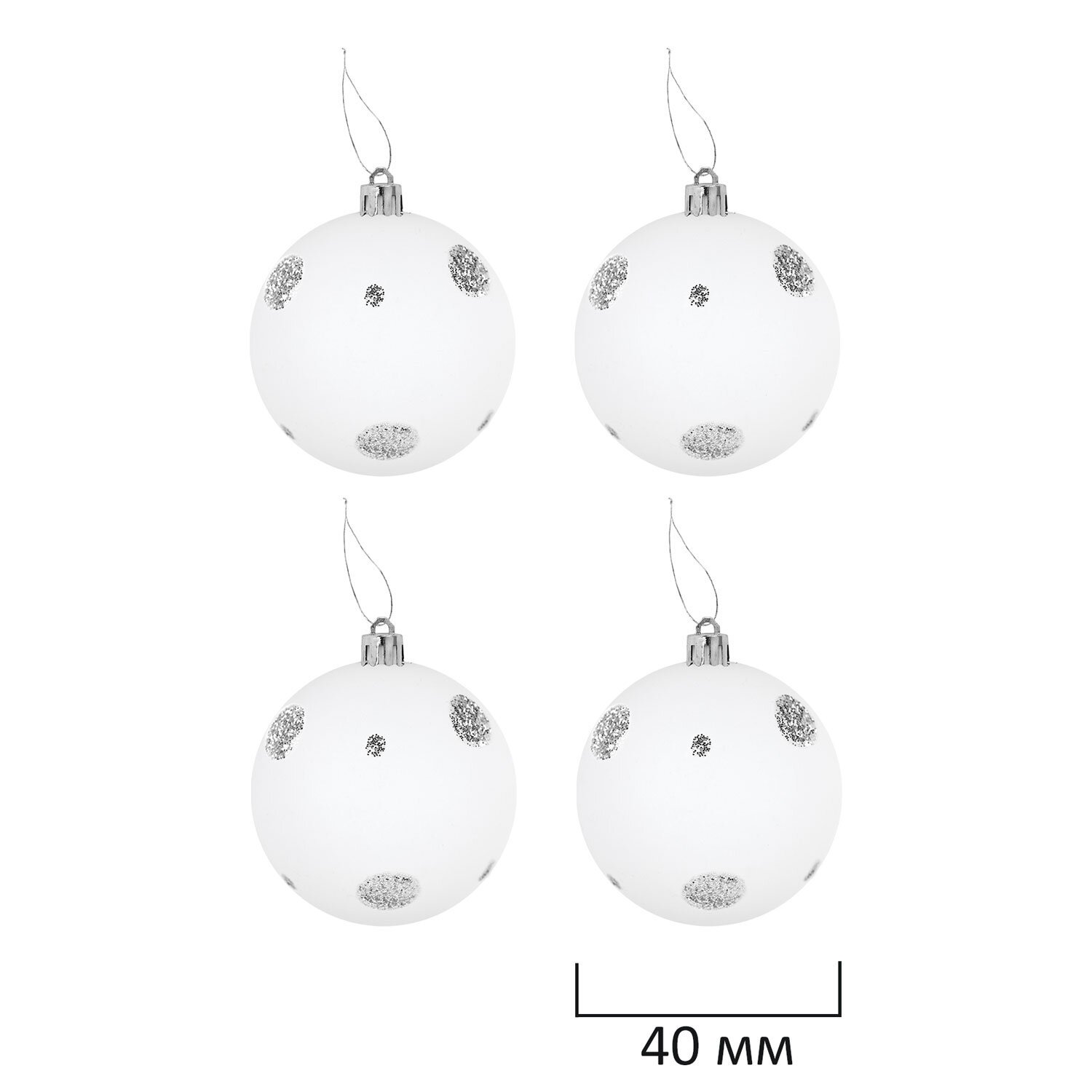 4 шара белого цвета с матовым эффектом и серебристым рисунком (диаметром 4 см),