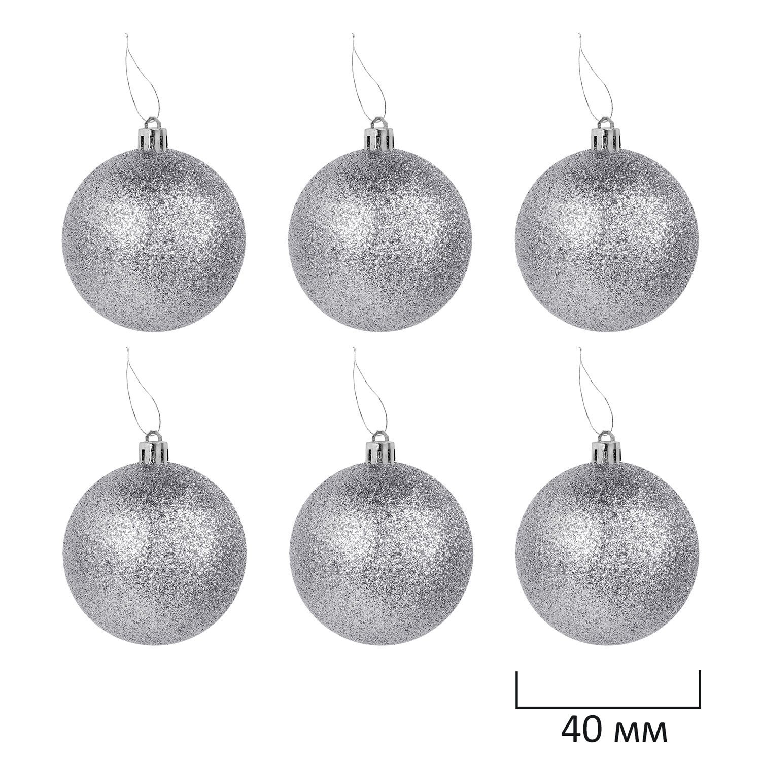 6 шаров серебристого цвета с эффектом глиттер (диаметром 4 см),