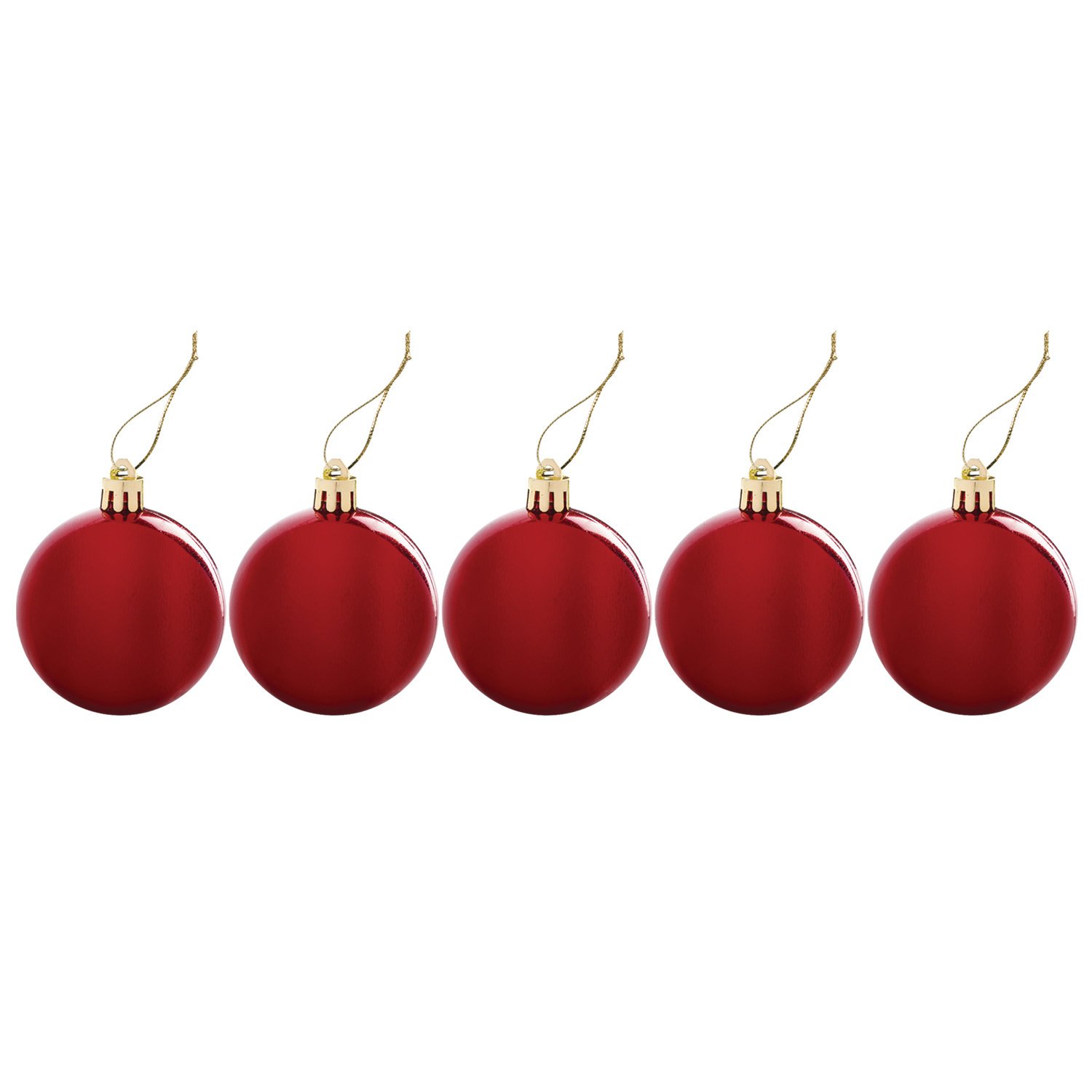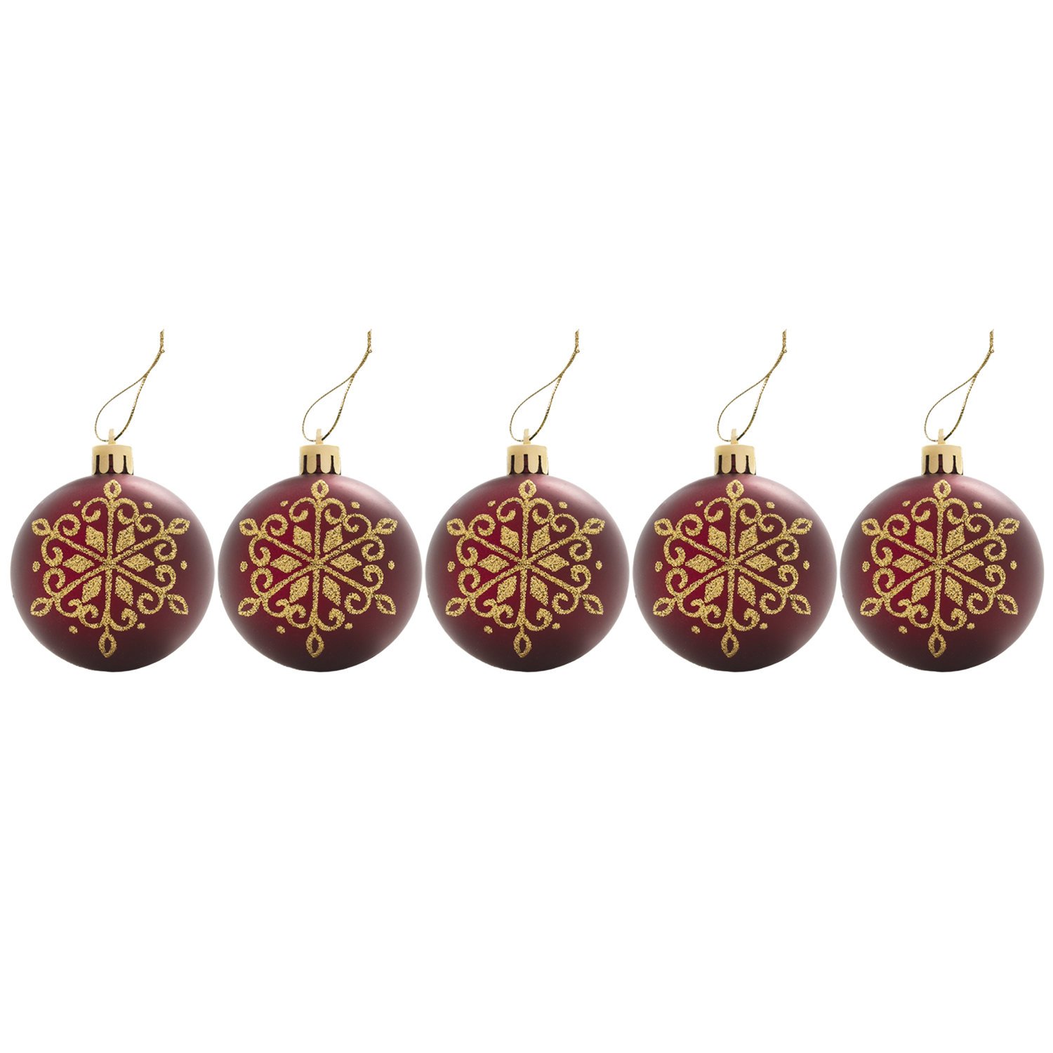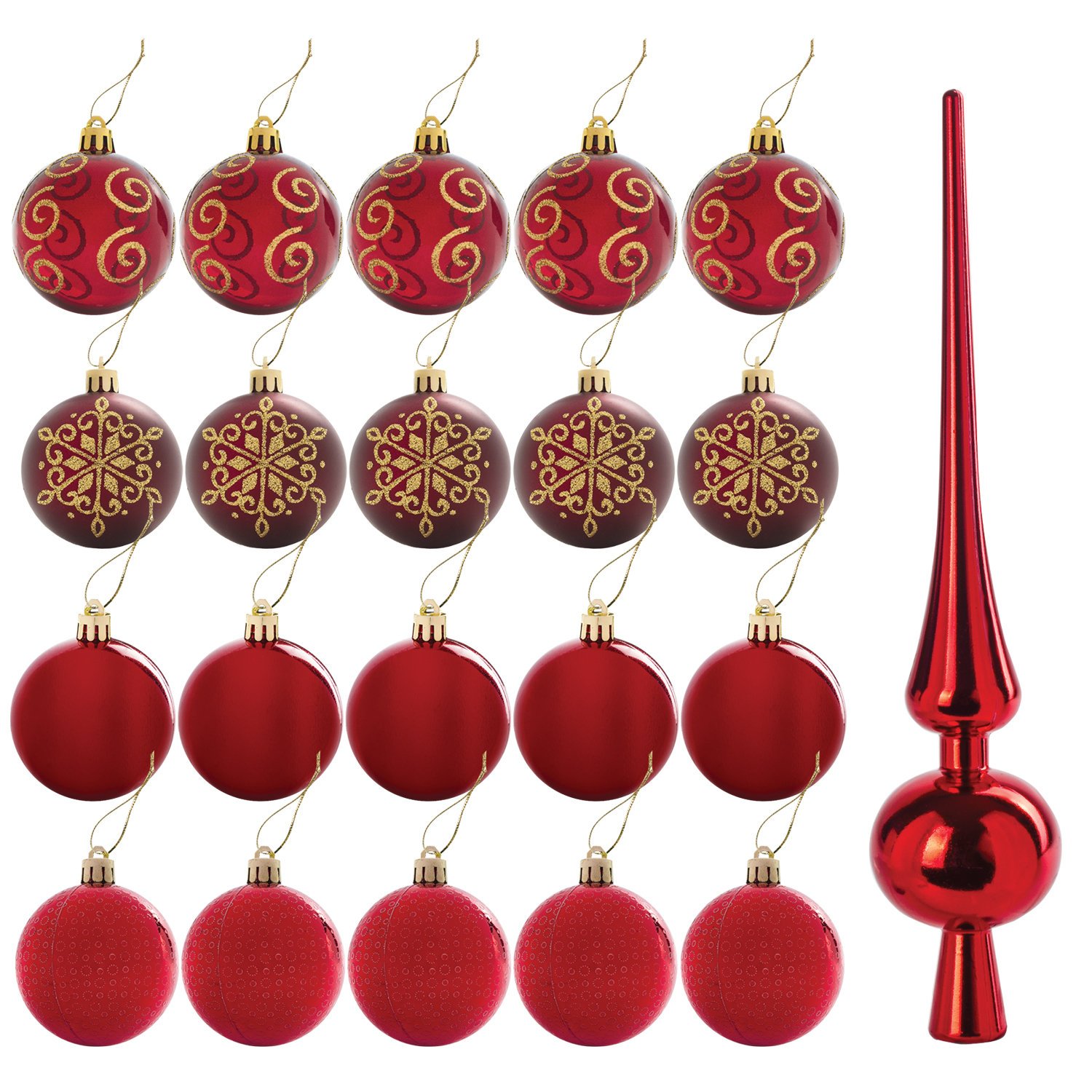 В набор входят: 5 шаров классического красного цвета с глянцевым покрытием (6 см), 5 шаров цвета "красное вино" с матовым покрытием и рисунком (6 см), 5 шаров красного цвета с текстурой (6 см), 5 прозрачных шаров винного цвета с рисунком (6 см) и наконечник на ель красного цвета с глянцевым покрытием (28 см).