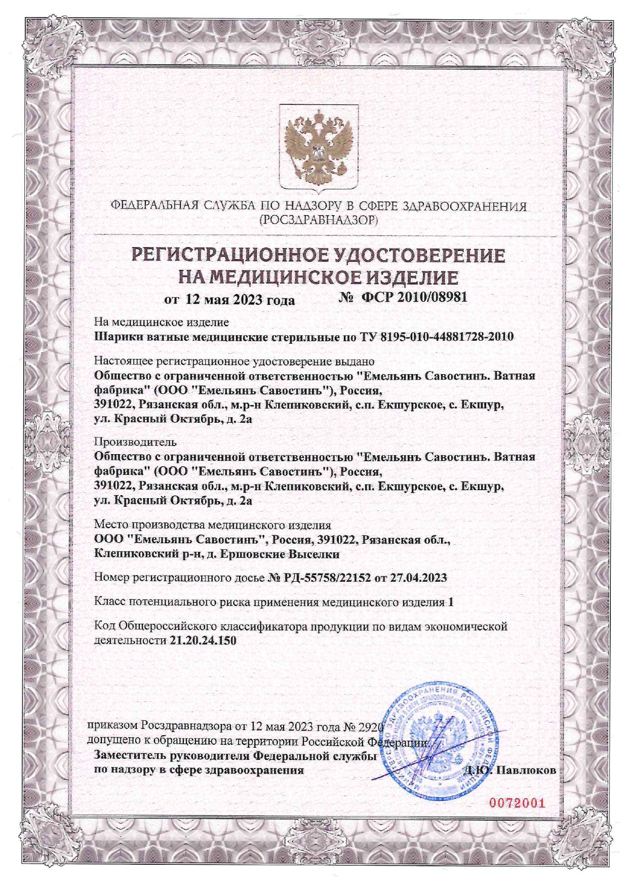 Шарик ватный медицинский ЕМЕЛЬЯНЪ САВОСТИНЪ стерильный, пакет 20 шт., 10 гр.