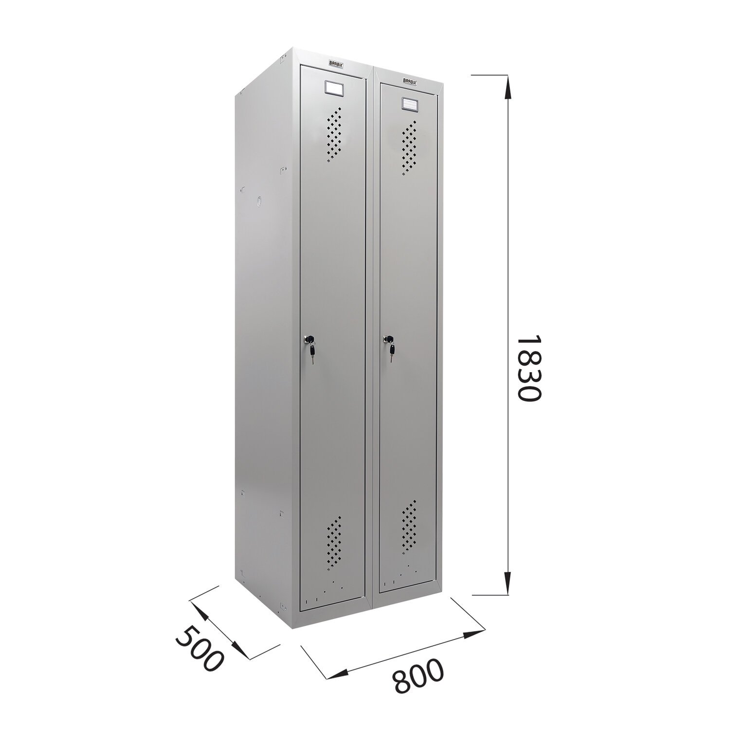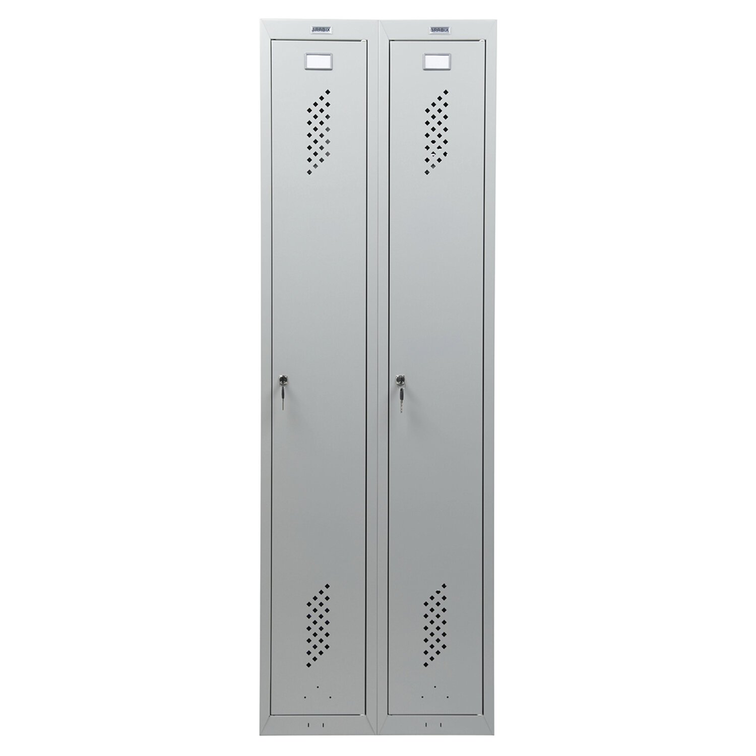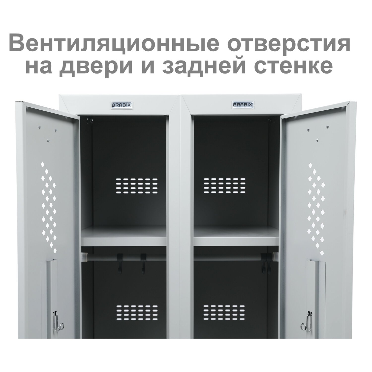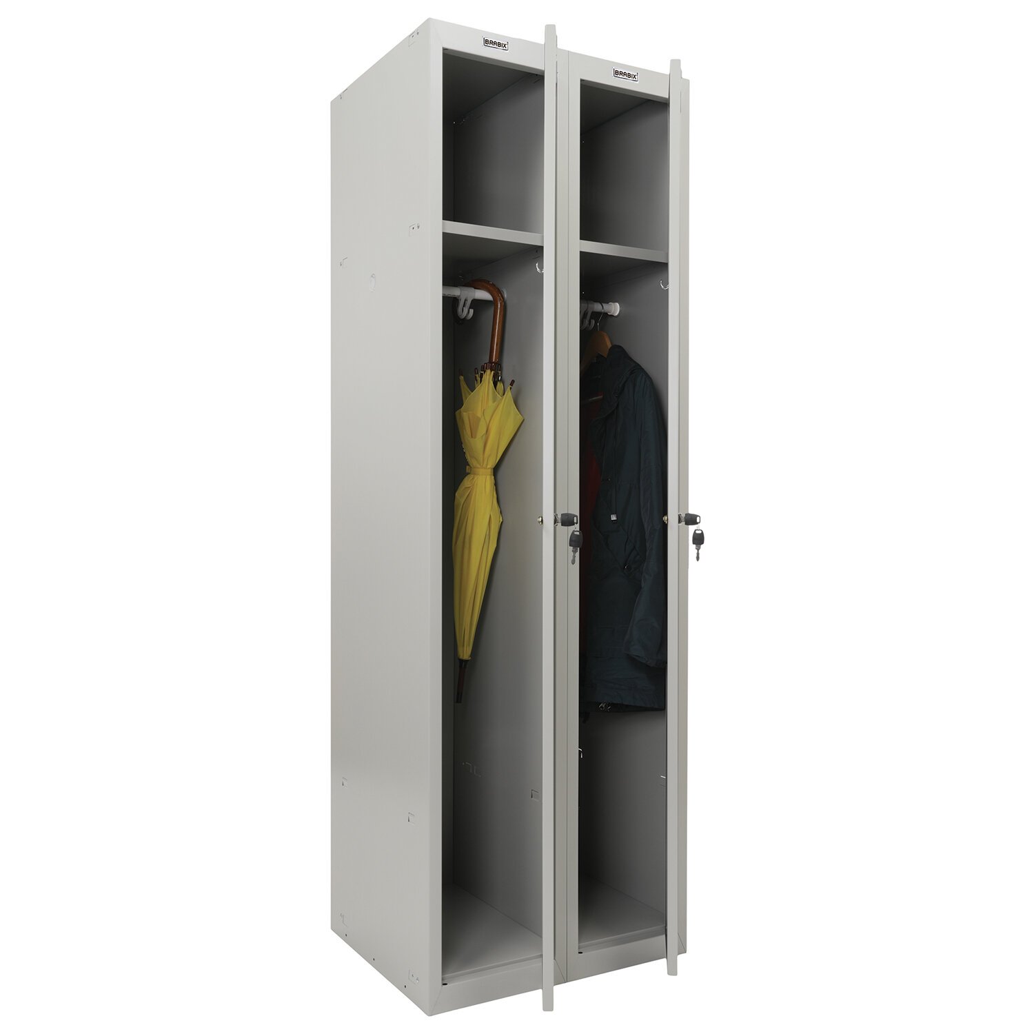 Шкаф имеет 2 раздельные секции и предназначен для двух пользователей. На дверях установлены ключевые замки (2000 комбинаций). На каждую дверь в комплекте 2 ключа.
