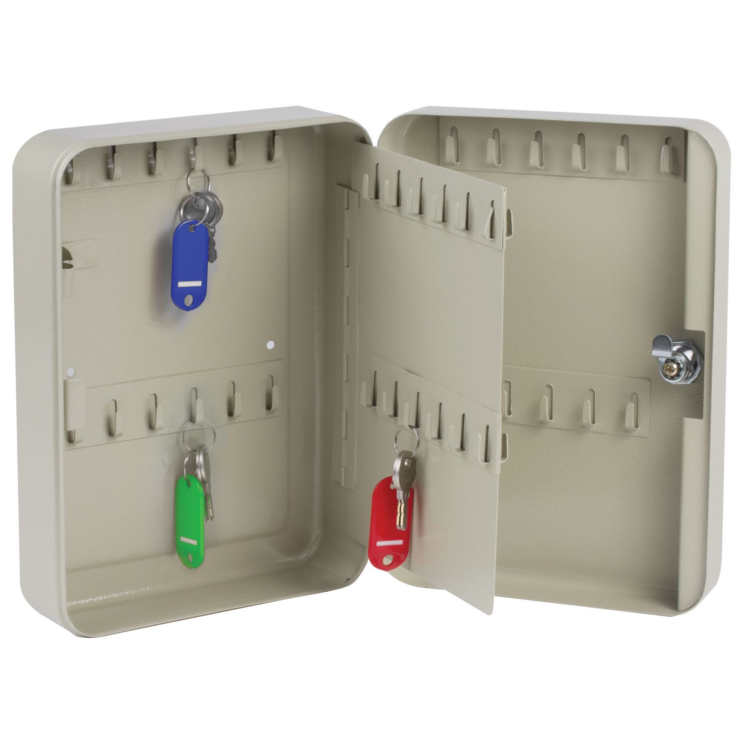 Изготовлен из прочной стали толщиной 0,8 мм и оснащен надёжным замком. Вмещает 48 ключей. Для размещения каждого ключа в шкафчике предусмотрен брелок с ярлычком. Размер - 250x180х80 мм. В комплекте: 2 ключа от дверцы, наклейки для нумерации крючков, шурупы для крепления.
