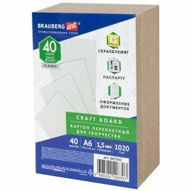 Картон переплетный, толщина 1,5 мм, А6 (105х148 мм), КОМПЛЕКТ 40 шт., BRAUBERG ART, 665562