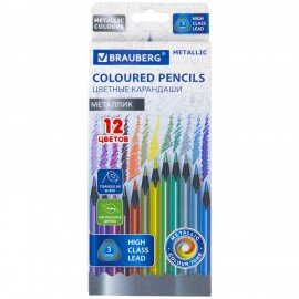 Карандаши цветные BRAUBERG METALLIC, 12 цветов металлик, трехгранные, грифель 3 мм, черное дерево, 181853