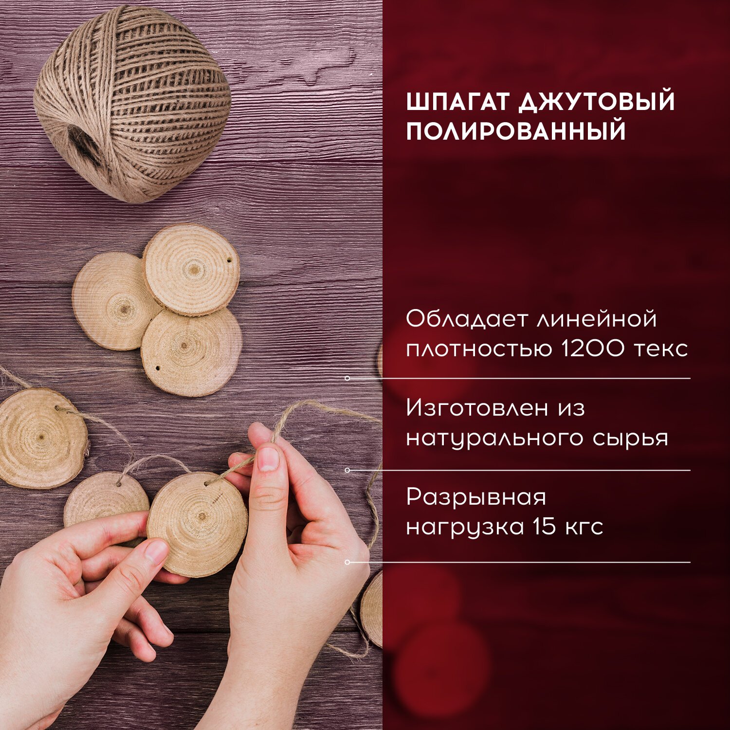 Длина шпагата - 100 м, диаметр нити - 1,5 мм, линейная плотность - 1200 текс. Каждый клубок упакован в термоусадочную пленку.
