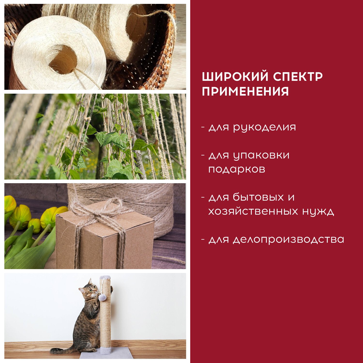 Шпагат отличается высокой прочностью, износостойкостью, не накапливает статическое электричество, устойчив к негативному воздействию ультрафиолета и резкому перепаду температур. Имеет равномерную витую структуру без посторонних включений, не ворсится и не колется.