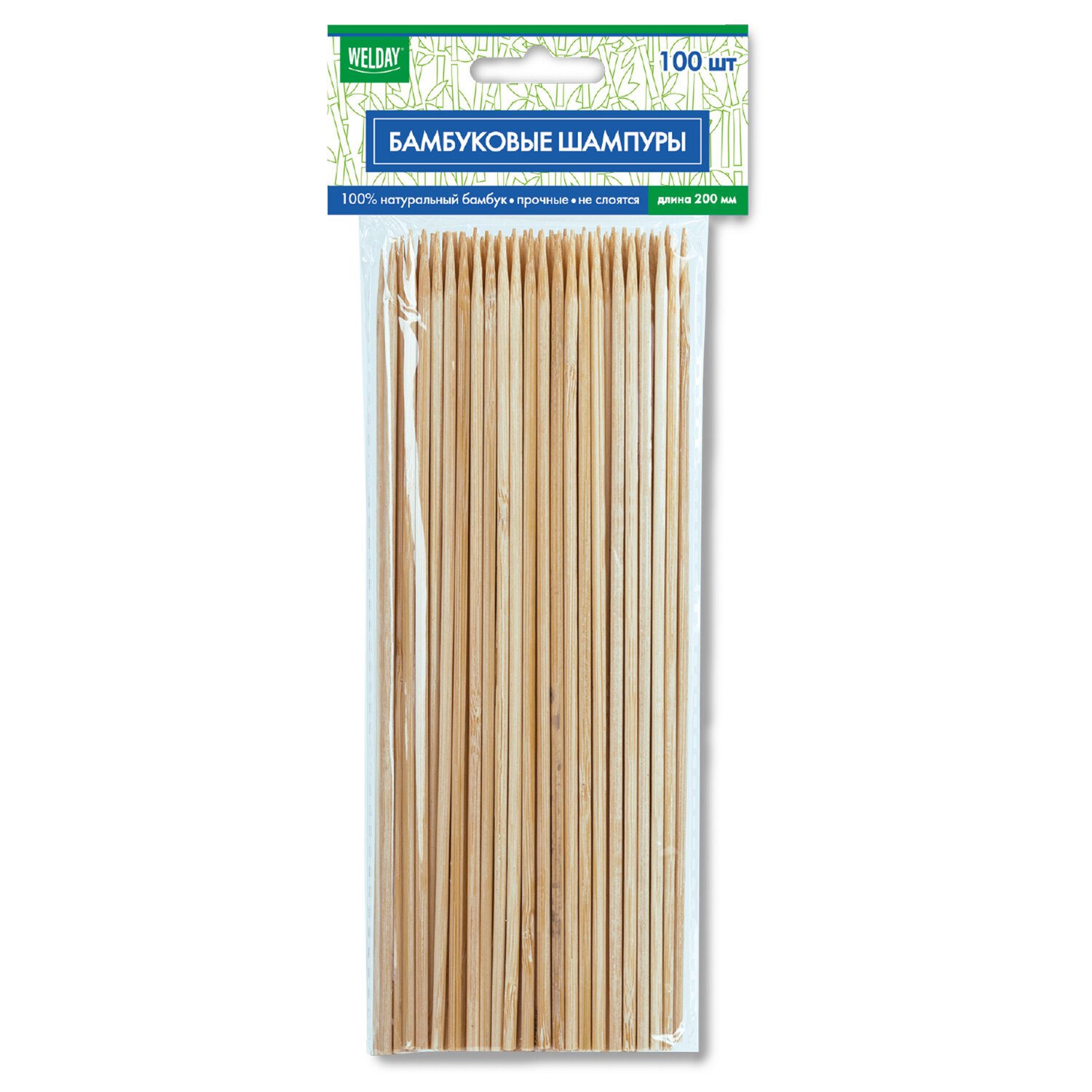 Шампуры изготовлены из бамбука. Безопасны при использовании, так как не выделяют вредных веществ и не меняют вкус продуктов. Шампур представляет собой шпажку с заостренным концом с одной стороны и имеет круглое сечение. Длина - 200 мм. В комплекте 100 штук.