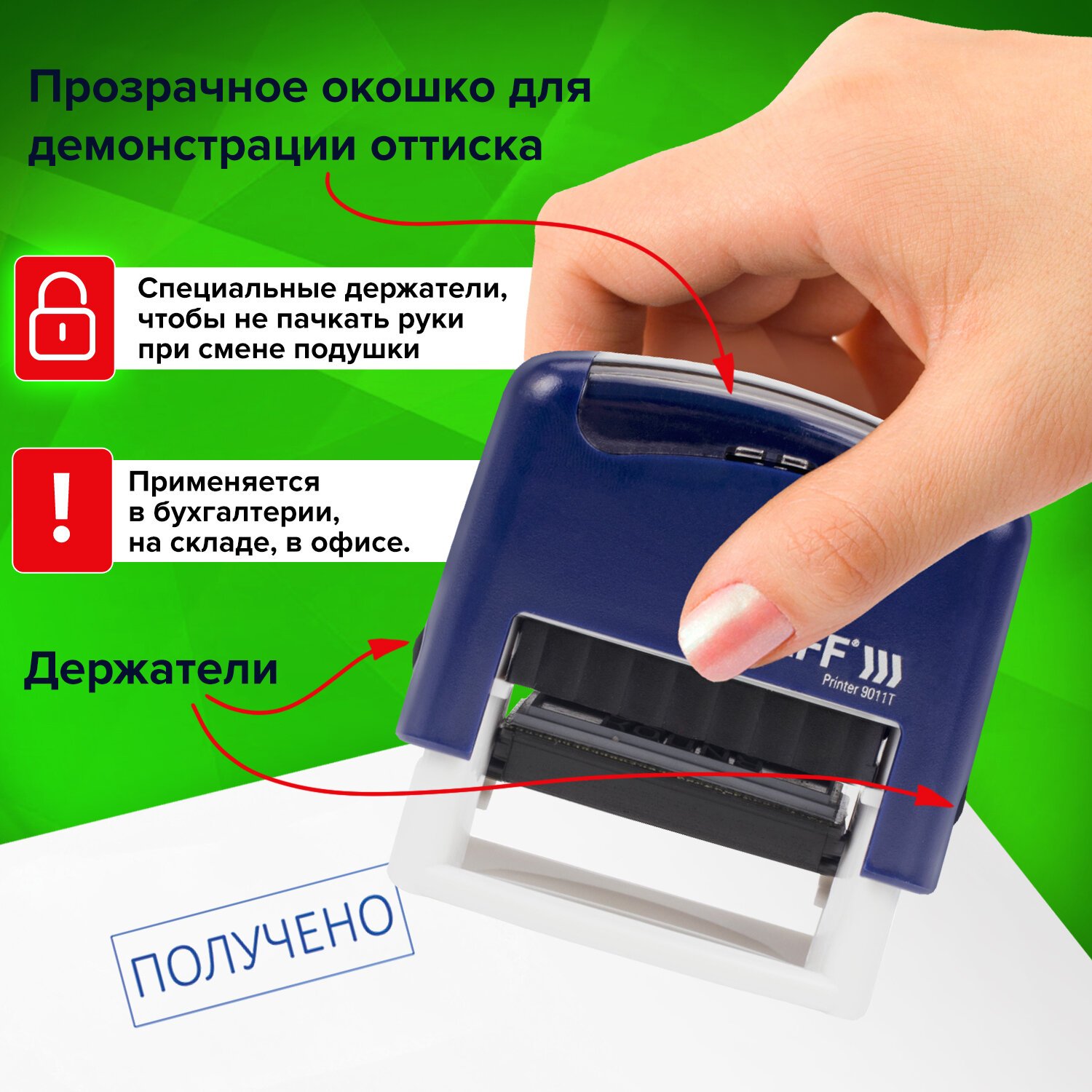 Штамп STAFF "Printer 9011T" предназначен для создания оттиска со стандартным текстом "ПОЛУЧЕНО", что позволяет существенно экономить рабочее время при нанесении необходимых отметок на документы.