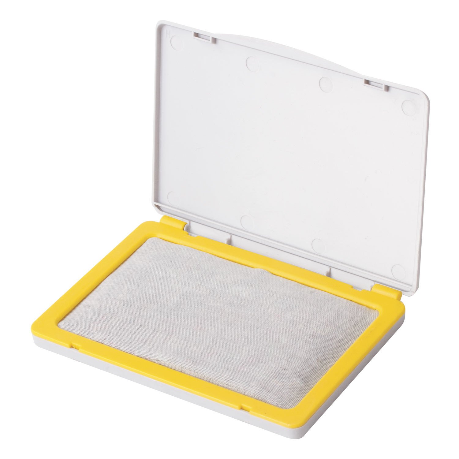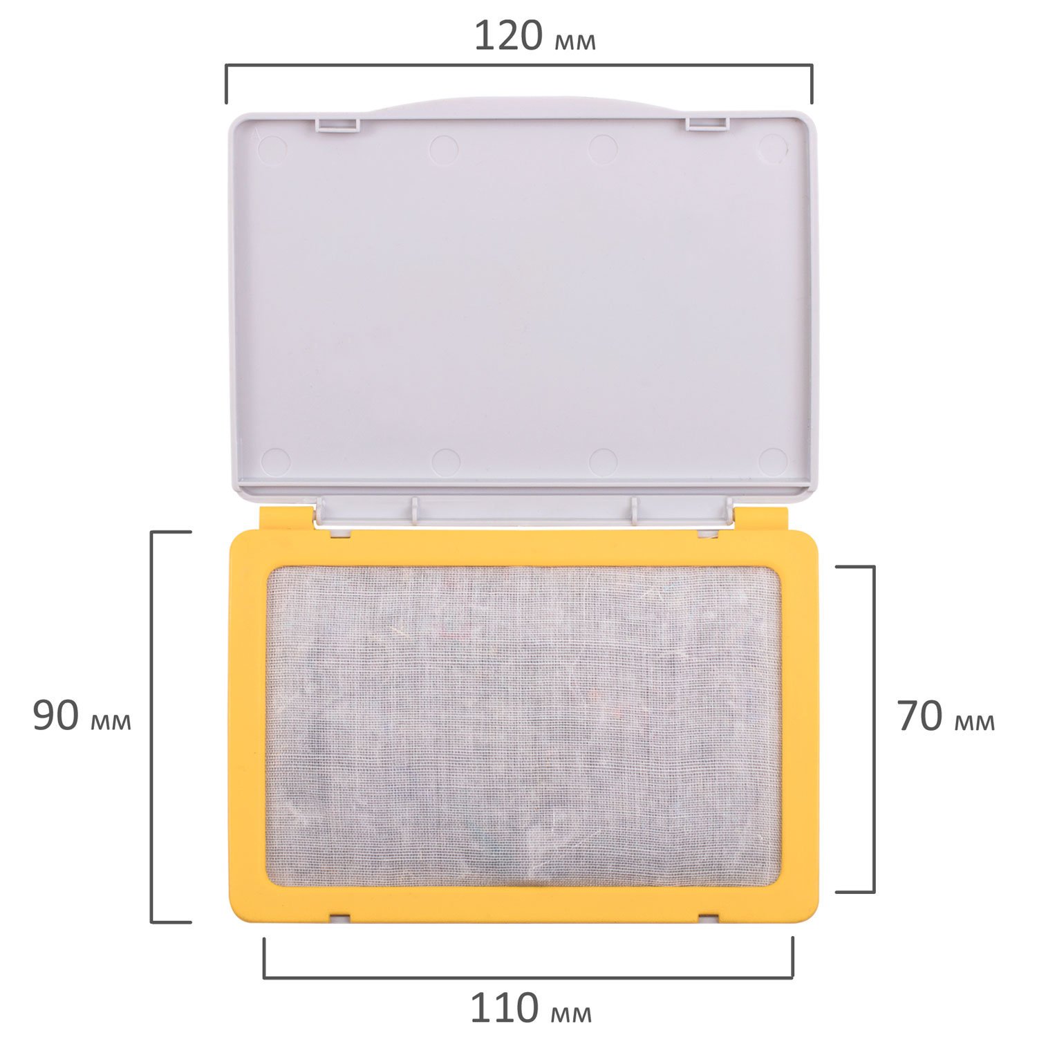 Неокрашенная штемпельная подушка. Крышка пластикового корпуса коробочки закрывается плотно, препятствуя испарению влаги. Размер – 120х90 мм, рабочая поверхность – 105х65 мм.