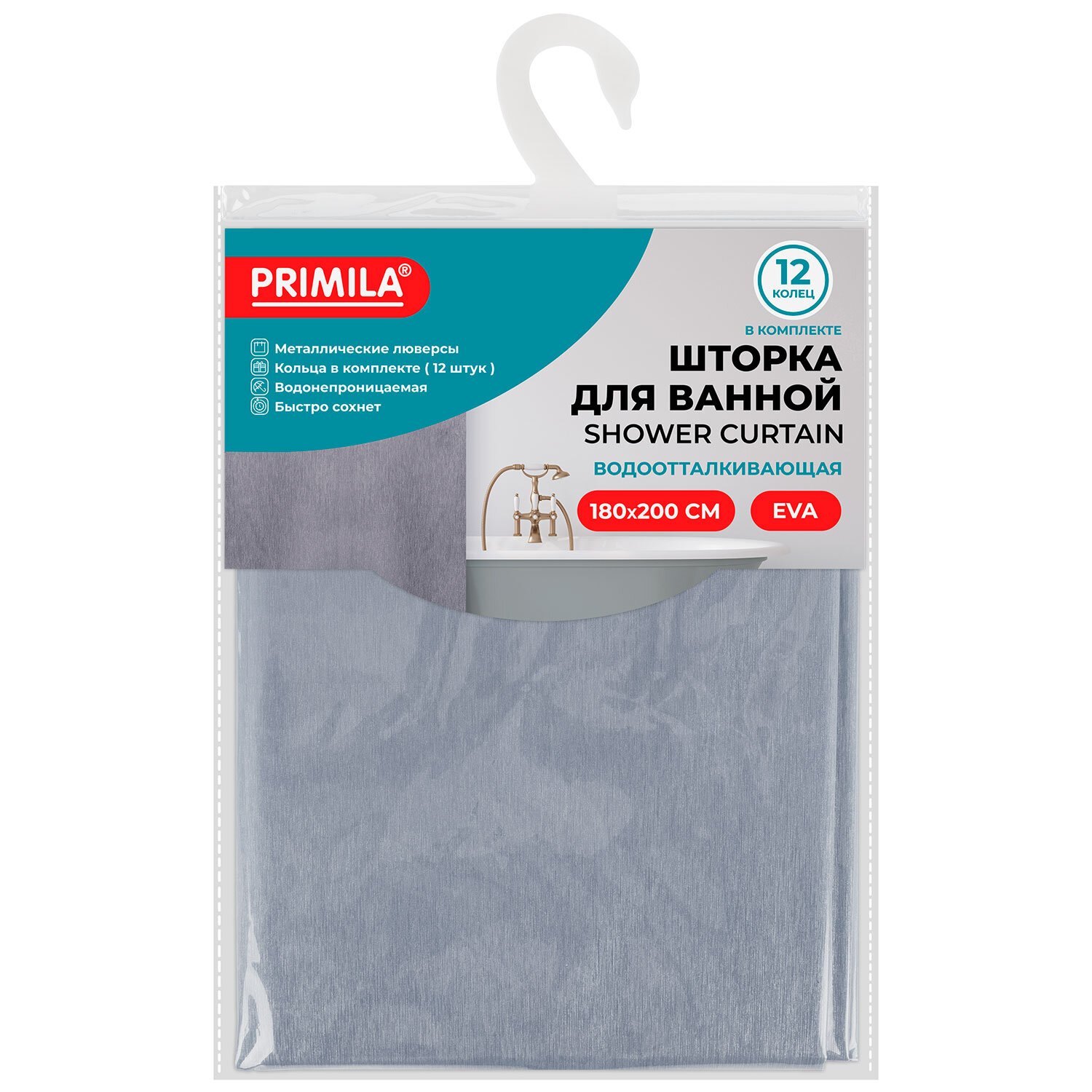 Шторка для ванной EVA, 180х200см, кольца в комплекте, СЕРАЯ ЛЕДЯНАЯ СВЕЖЕСТЬ, PRIMILA, 700101