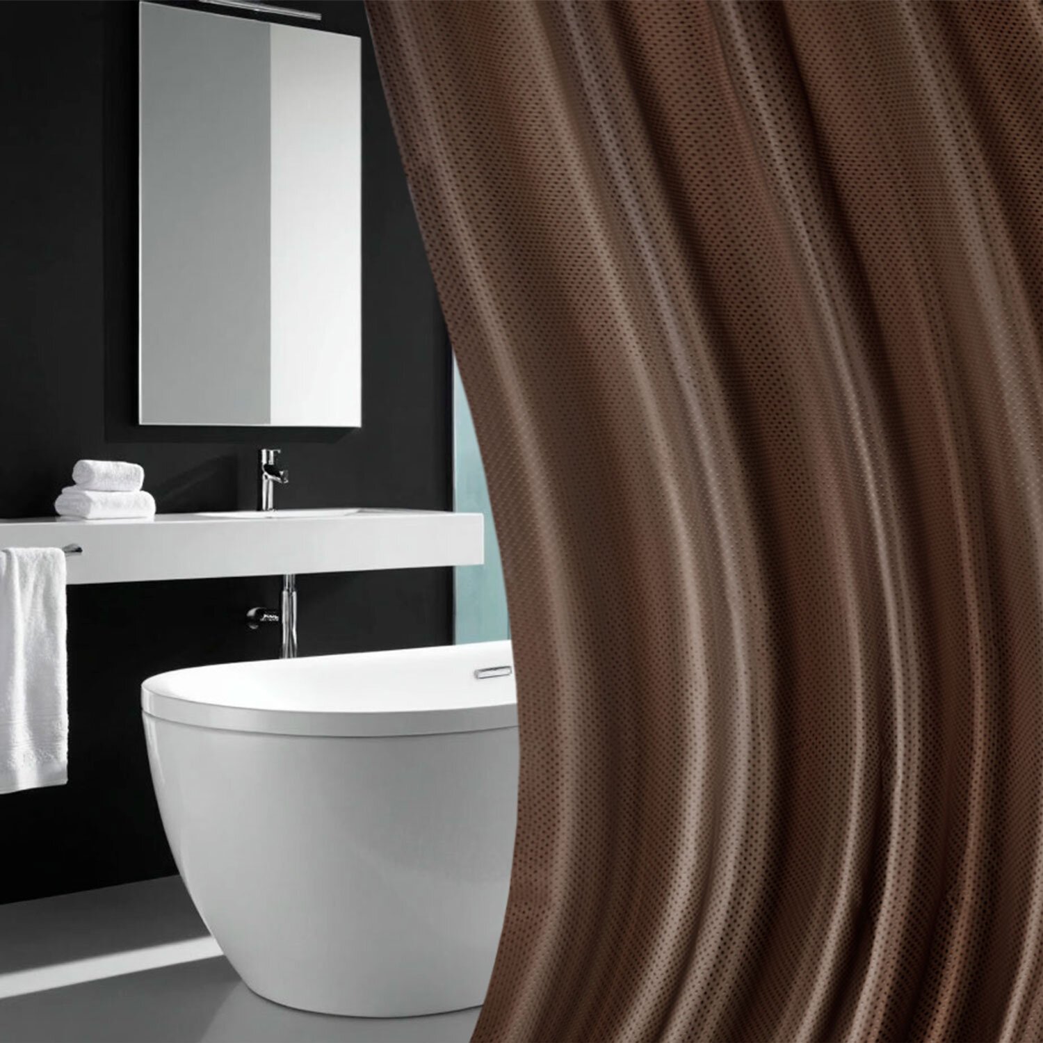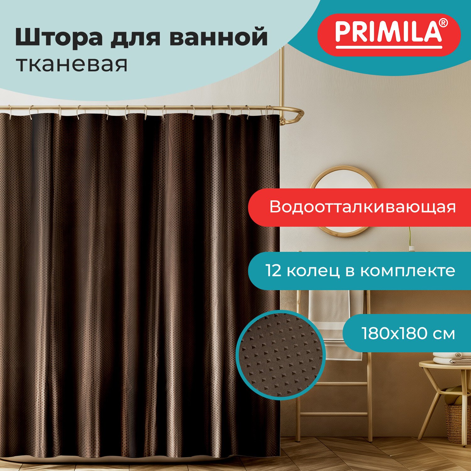 Шторка для ванной ПОЛИЭСТЕР, 180х180см, кольца в комплекте, КОРИЧНЕВЫЙ БРИЛЛИАНТ, PRIMILA, 700091