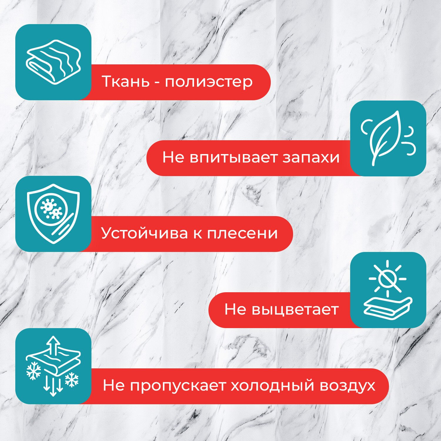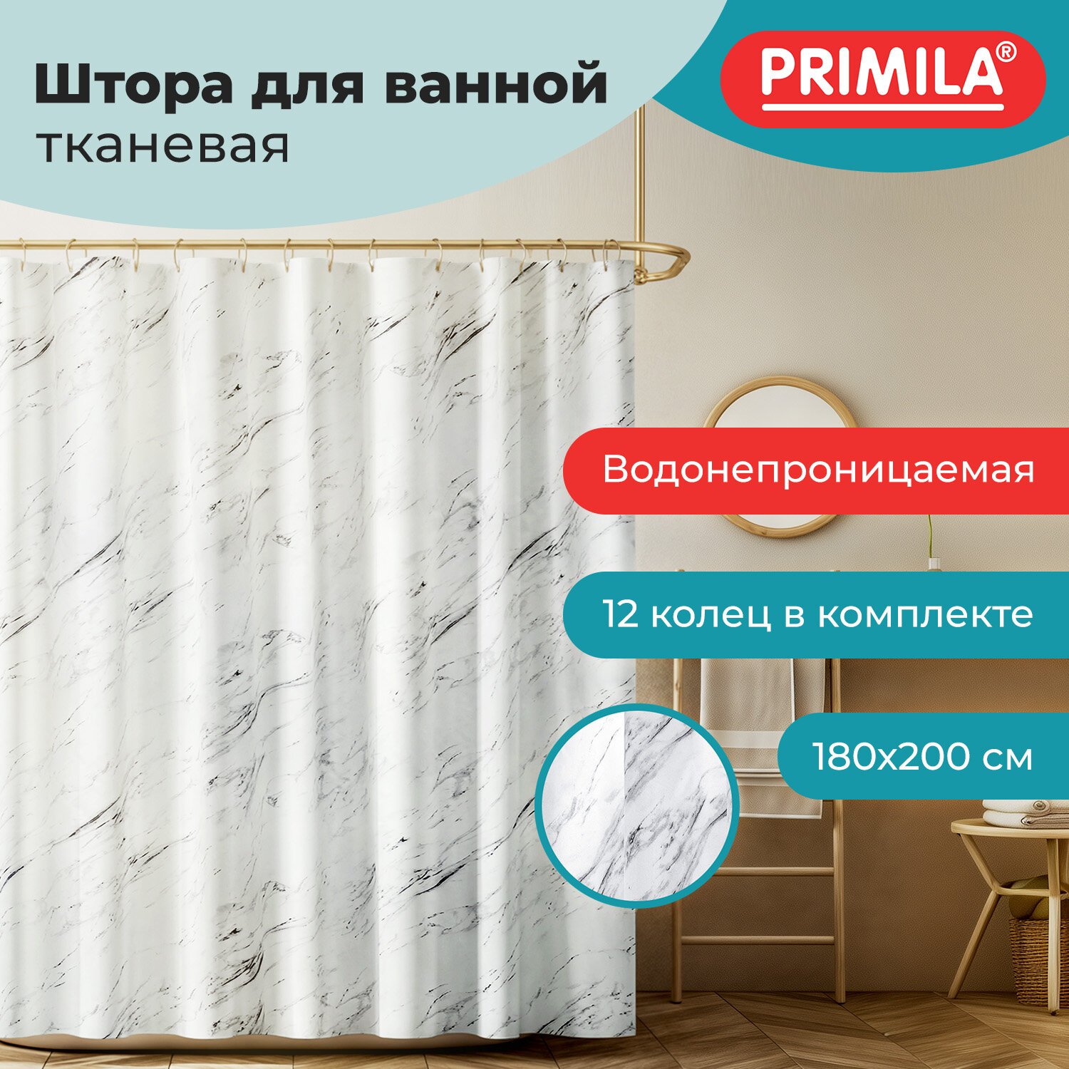 Шторка для ванной ПОЛИЭСТЕР, 180х200см, кольца в комплекте, МРАМОР, PRIMILA, 700084