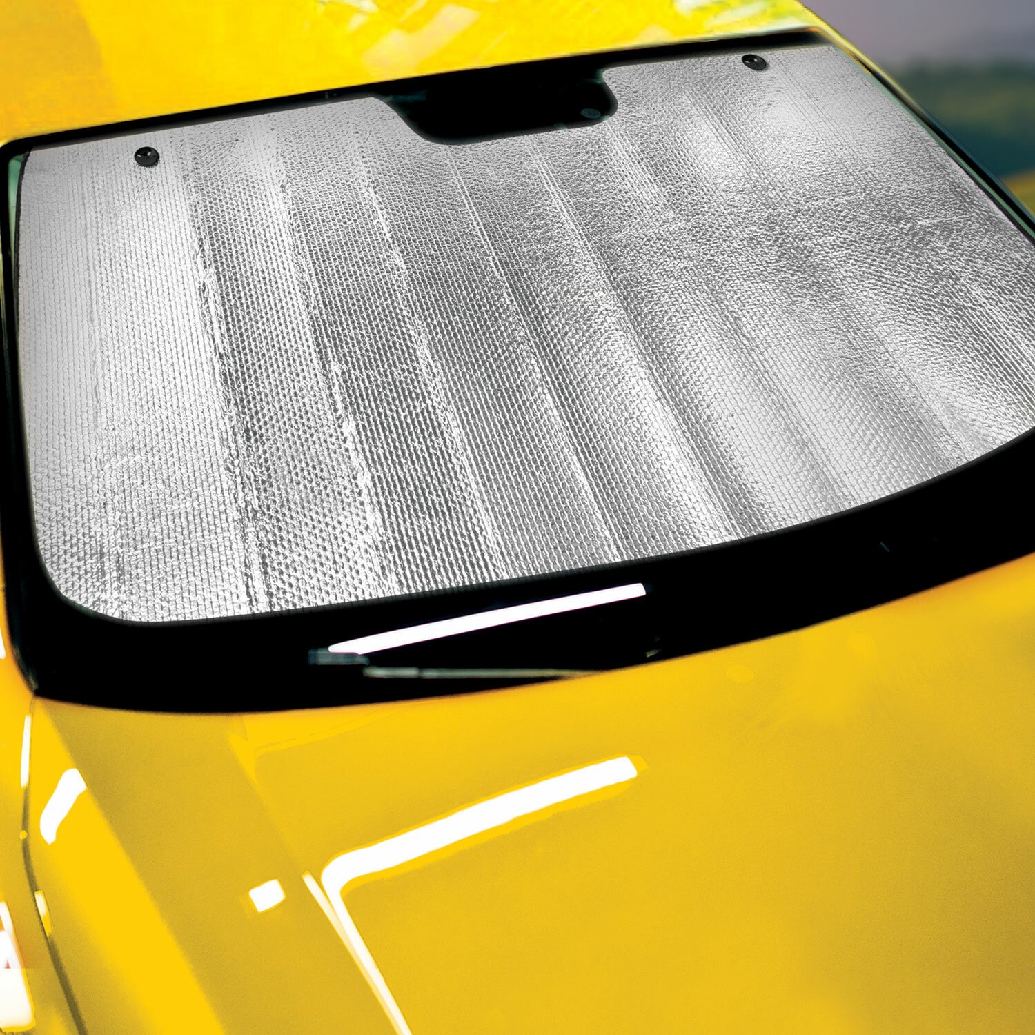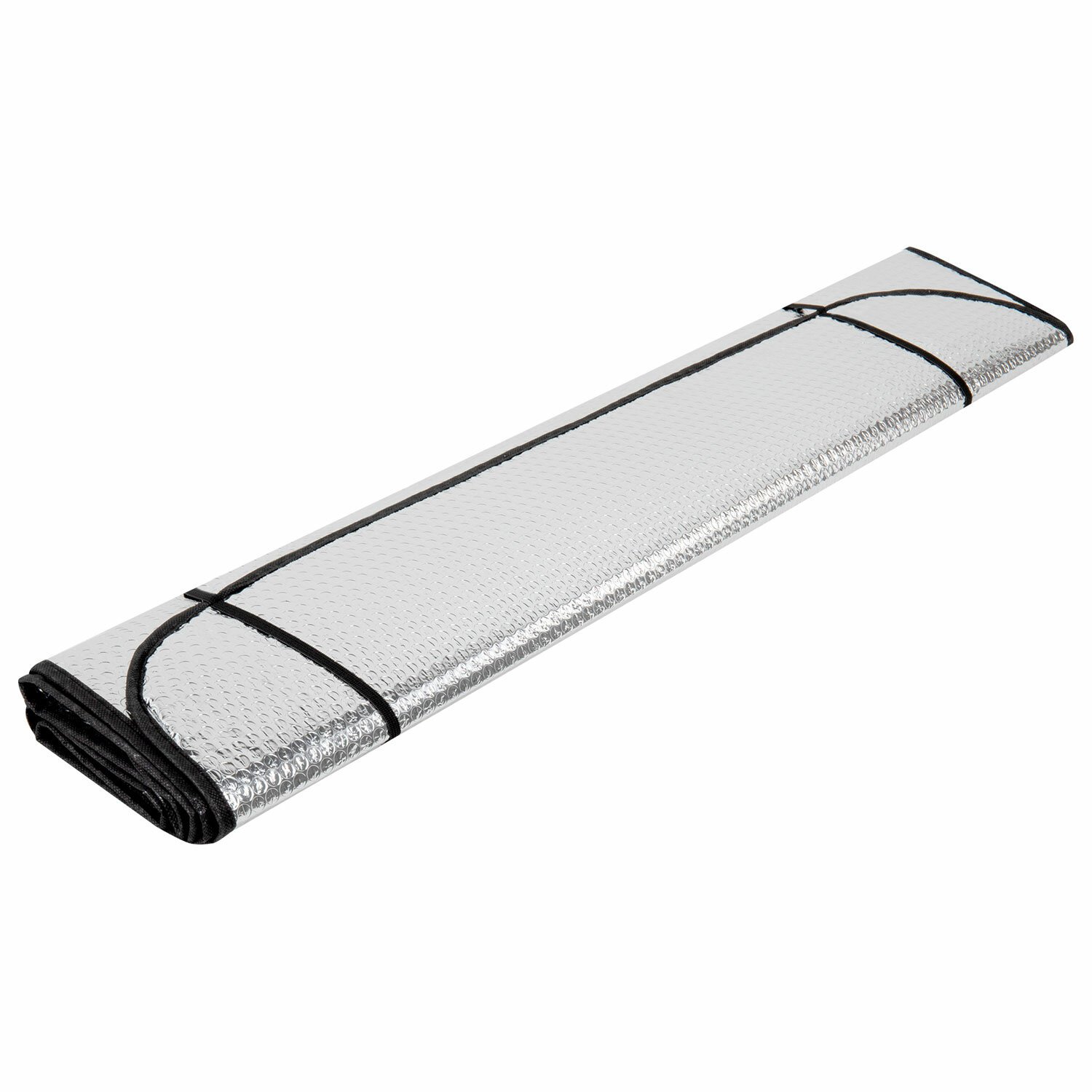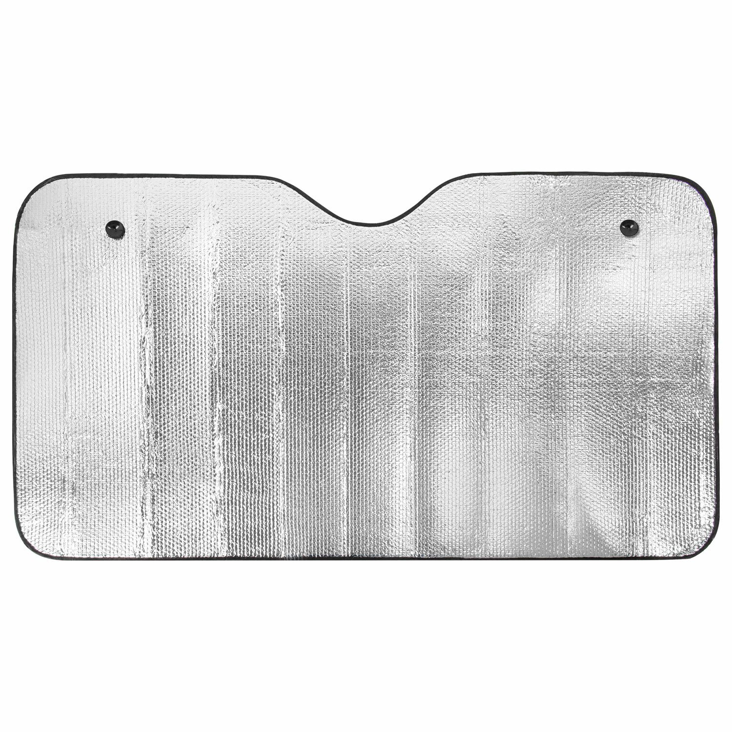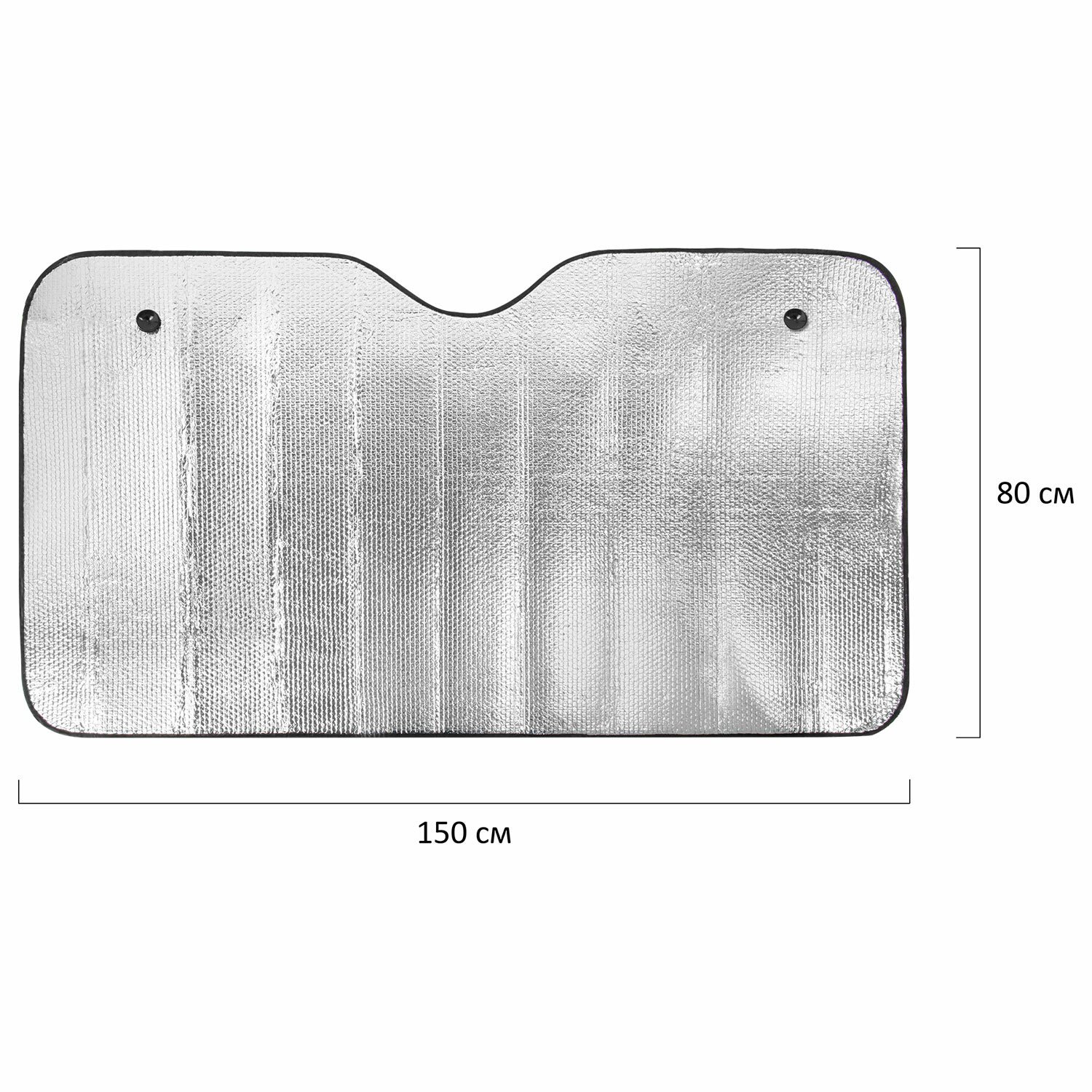 Серебристая поверхность шторки отражает солнечные лучи, препятствует нагреванию салона, защищает салон и торпеду от выгорания. Крепится на лобовое стекло автомобиля с помощью двух присосок. Размеры: ширина – 150 см, высота – 80 см.