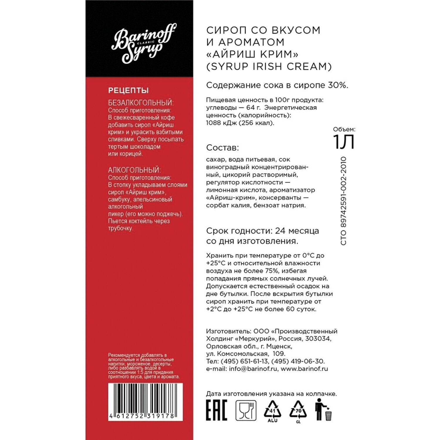 Сироп BARINOFF "Айриш-Крим", 1 л, стеклянная бутылка
