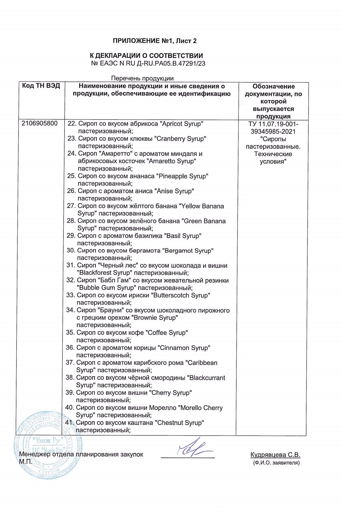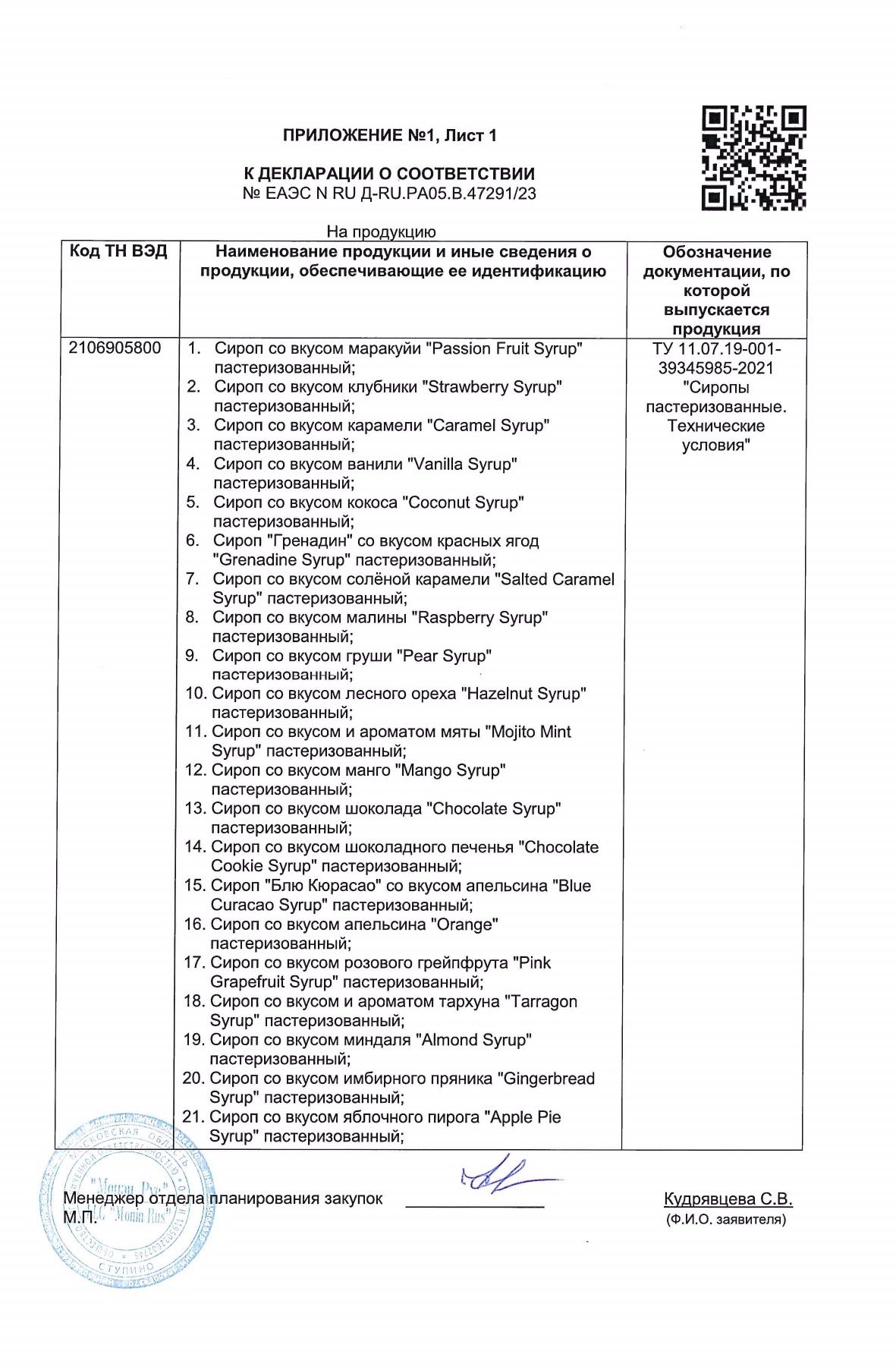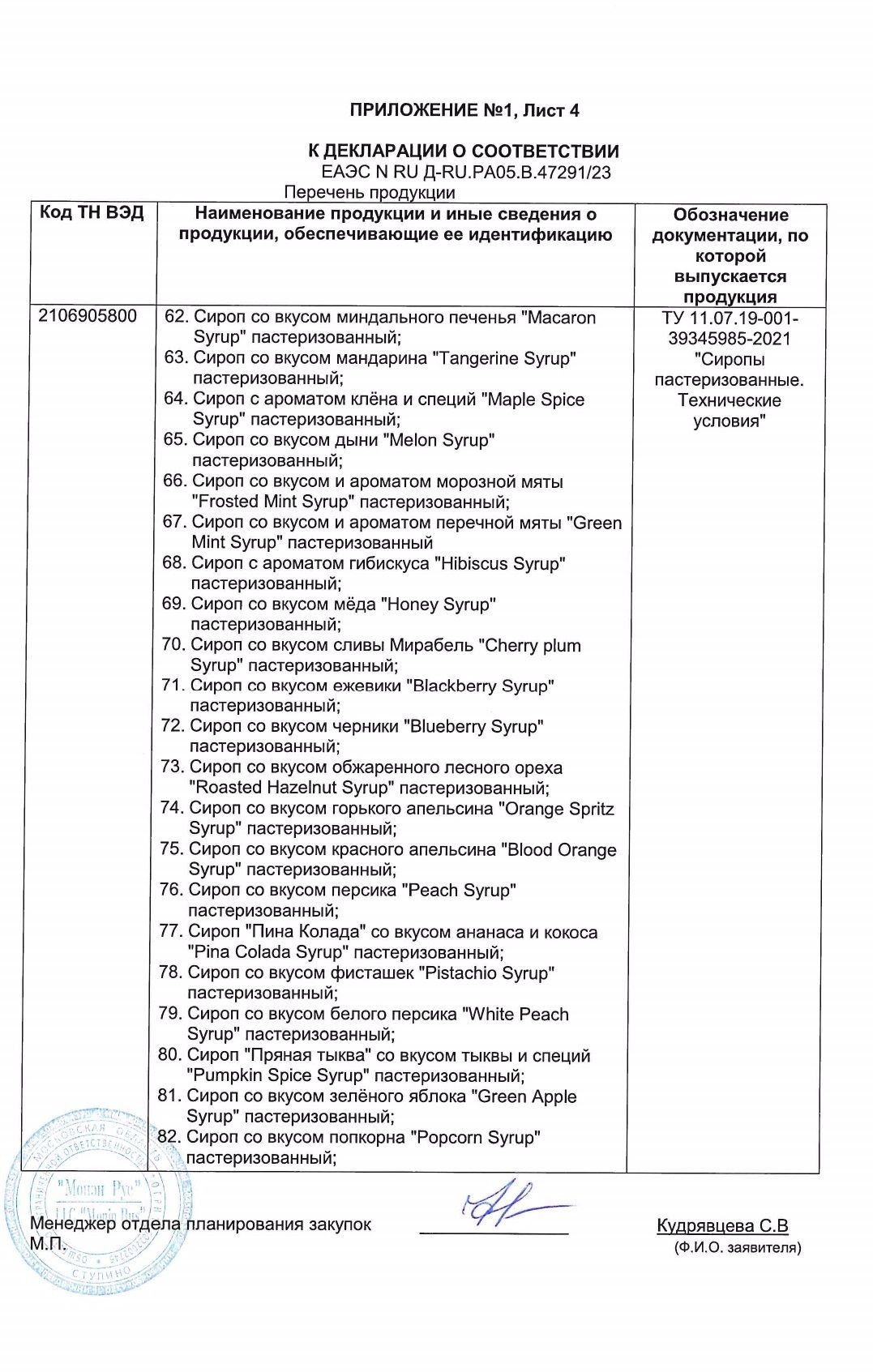 Рекомендация по использованию: сироп добавлять по вкусу в коктейли, мороженое и десерты, либо разбавлять водой в соотношении 1:8.