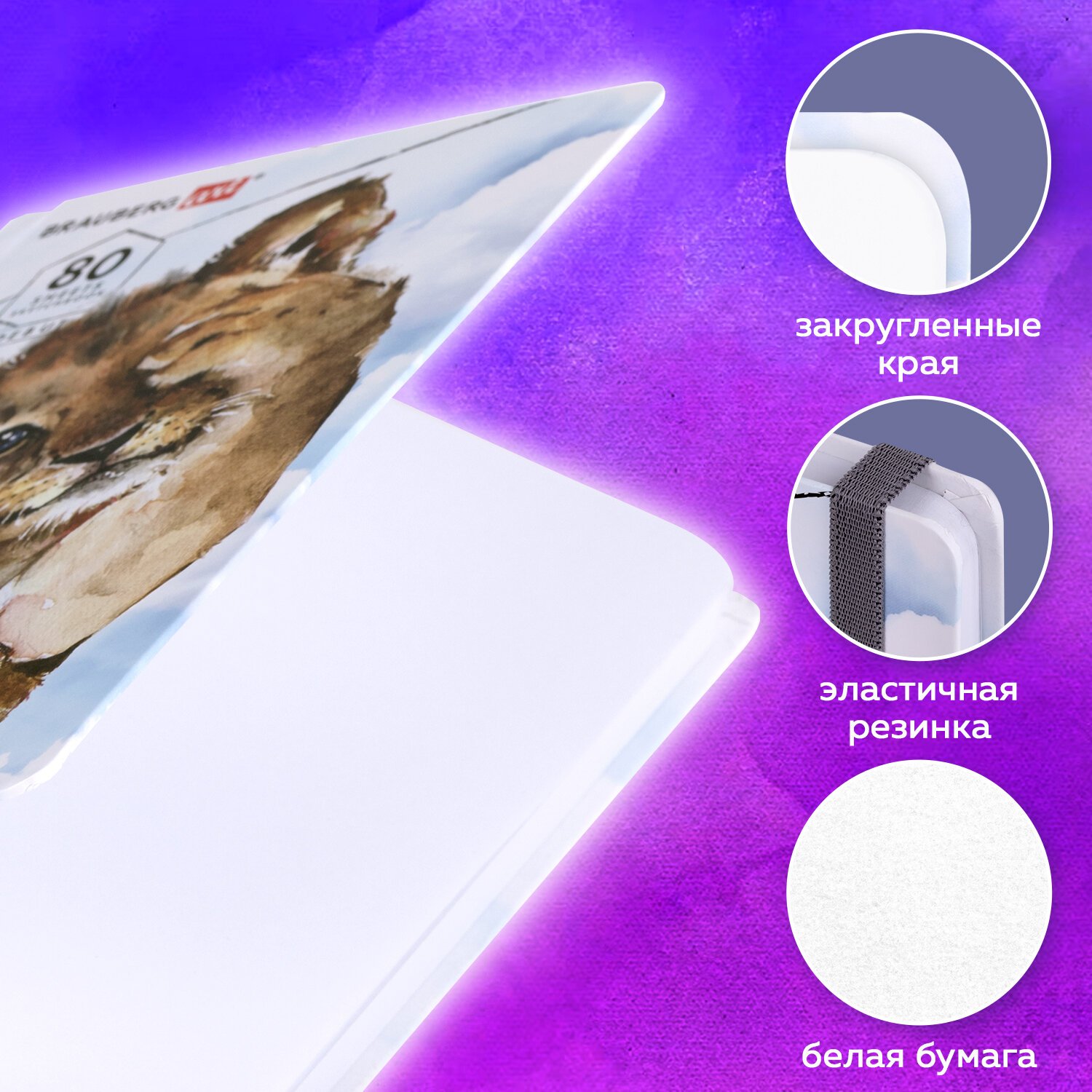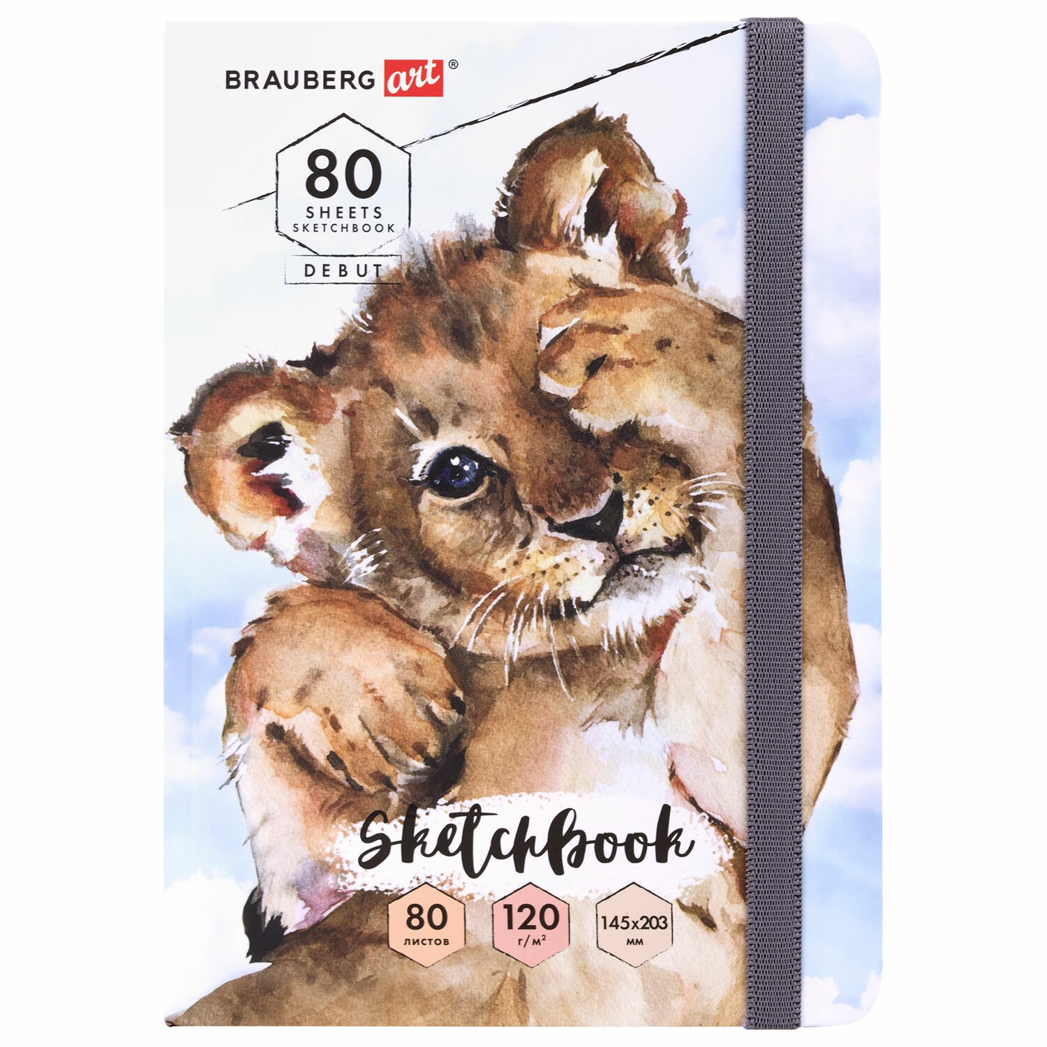 Скетчбук, белая бумага 120 г/м2, 145х203 мм, 80 л., резинка, твердый, BRAUBERG ART DEBUT "Львёнок", 114585