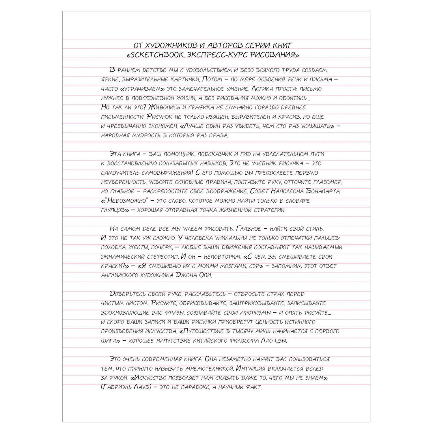 Эта книга может служить одновременно и учебником для рисования, и тетрадью для записей и рисунков, ведь на его страницах есть и упражнения для начинающих рисовальщиков, и пространство для собственных креативных идей.