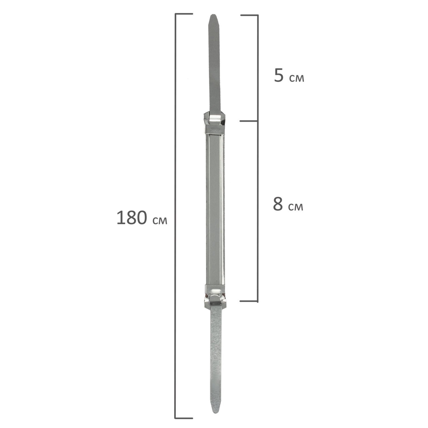 Изготовлены из металла. Механизмы надежно фиксируют бумаги. Вмещают до 400 листов. Длина ножек составляет 50 мм. Расстояние между отверстиями - 80 мм. Длина механизма - 180 мм. В комплект входит 50 штук.