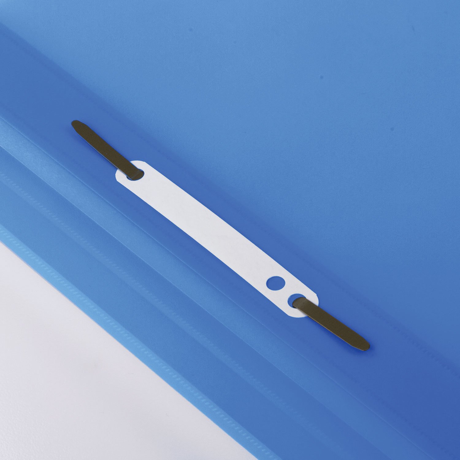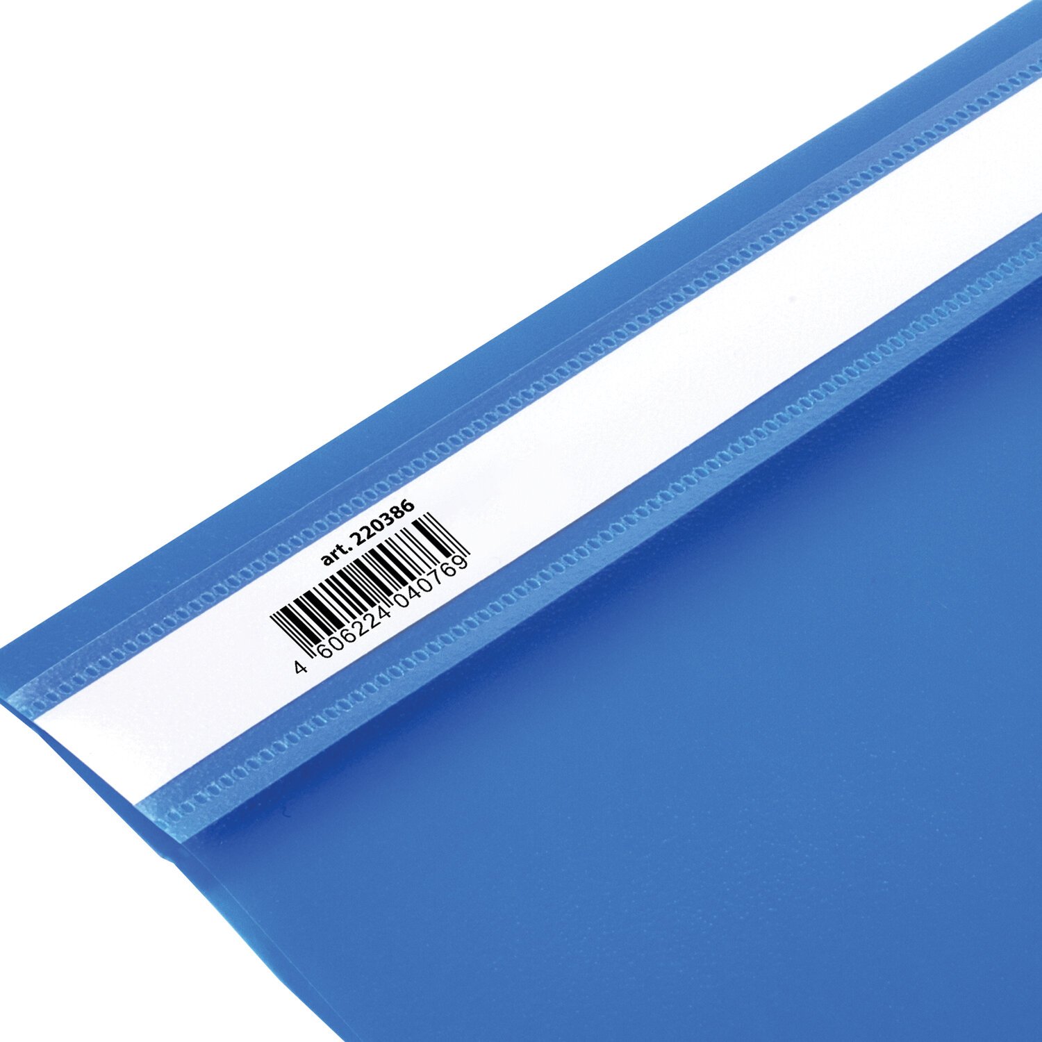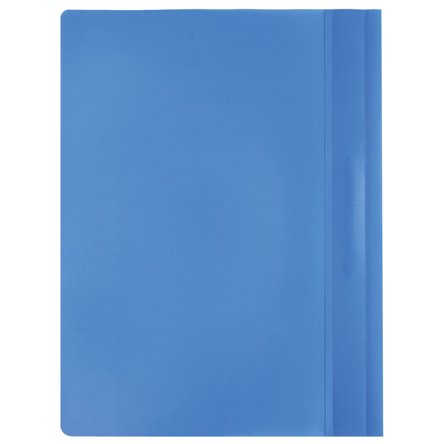 Фиксирует до 100 листов формата А4. Толщина пластика верхнего листа составляет 130 мкм, а нижнего - 180 мкм. Предельно простой механизм подшивки: металлические усики и пластиковая планка для надежной фиксации документов. Скоросшиватель изготовлен из качественного полипропилена. Прозрачный верхний лист позволяет определить содержимое, не открывая скоросшиватель, который к тому же снабжен сменным пластиковым корешком, что дает возможность структурировать информацию. Благодаря фактуре "песок" и яркому голубому цвету обложки папка никогда не затеряется на полке.