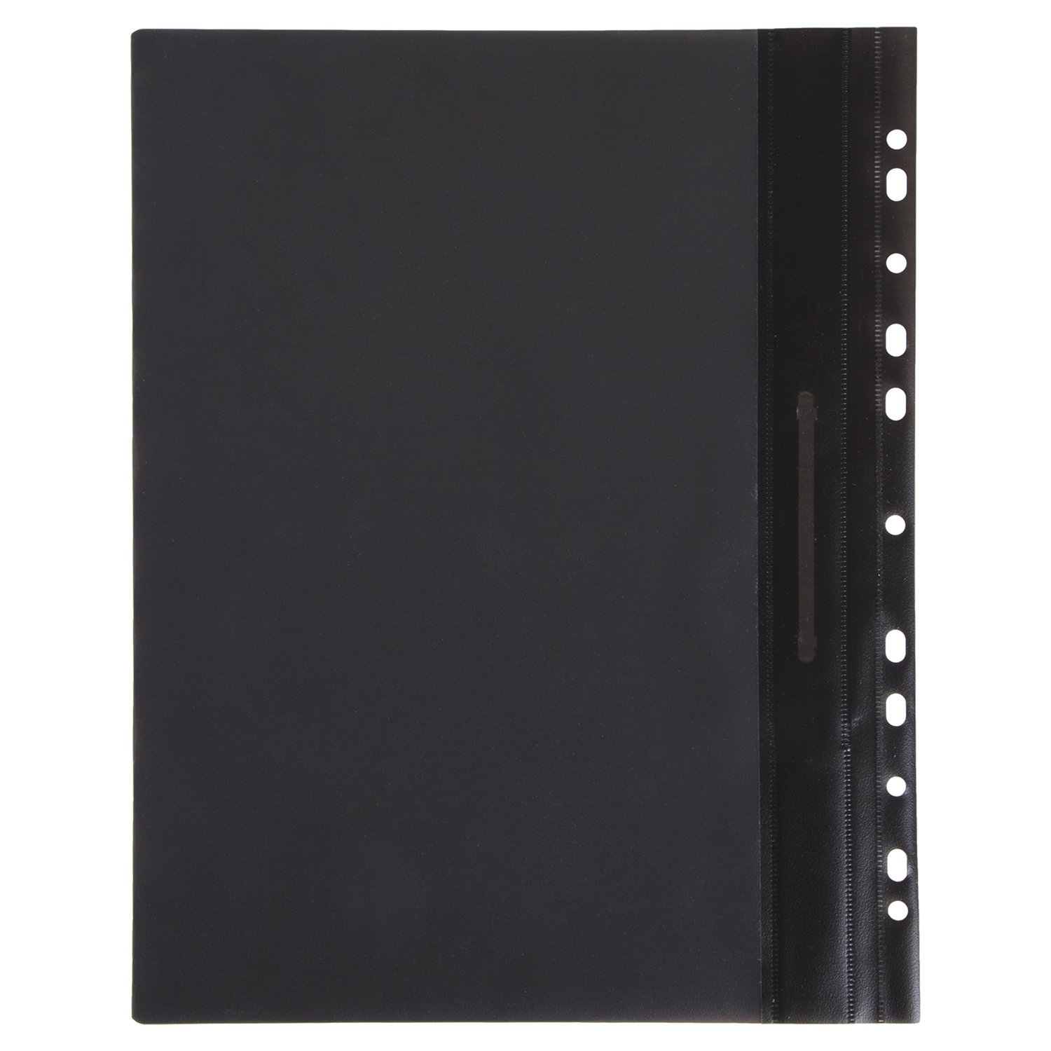 Фиксирует до 100 листов формата А4. Толщина пластика верхнего листа составляет 140 мкм, а нижнего - 180 мкм. Предельно простой механизм подшивки: металлические усики и пластиковая планка для надежной фиксации документов. Мультиперфорация по краю обложки позволяет подшивать изделие в папки с любым механизмом. Скоросшиватель изготовлен из качественного полипропилена. Прозрачный верхний лист позволяет определить содержимое, не открывая скоросшиватель, который к тому же снабжен сменным пластиковым корешком, что дает возможность структурировать информацию. Благодаря фактуре "песок" и строгому черному цвету обложки папка никогда не затеряется на полке.