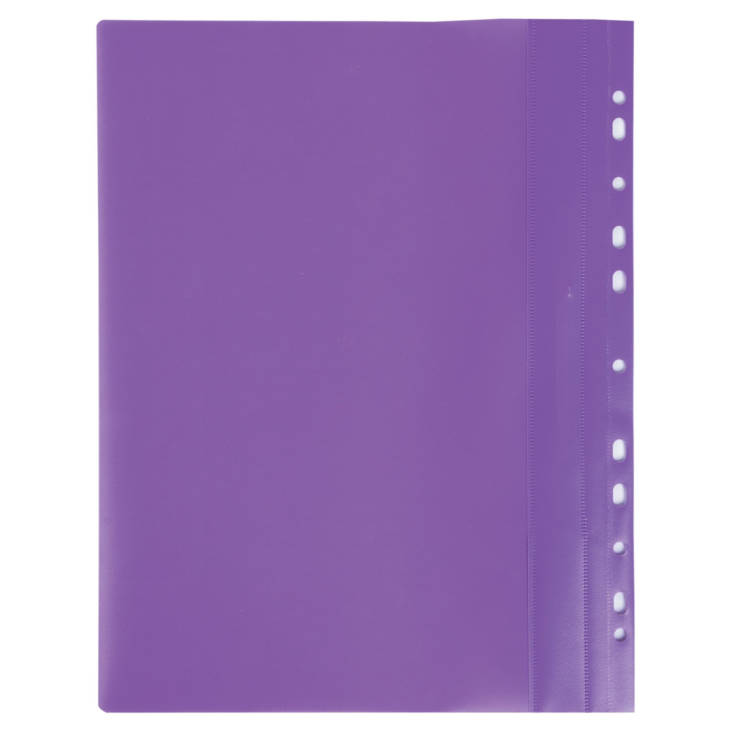 Фиксирует до 100 листов формата А4. Толщина пластика верхнего листа составляет 140 мкм, а нижнего - 180 мкм. Предельно простой механизм подшивки: металлические усики и пластиковая планка для надежной фиксации документов. Мультиперфорация по краю обложки позволяет подшивать изделие в папки с любым механизмом. Скоросшиватель изготовлен из качественного полипропилена. Прозрачный верхний лист позволяет определить содержимое, не открывая скоросшиватель, который к тому же снабжен сменным пластиковым корешком, что дает возможность структурировать информацию. Благодаря фактуре "песок" и яркому фиолетовому цвету обложки папка никогда не затеряется на полке.