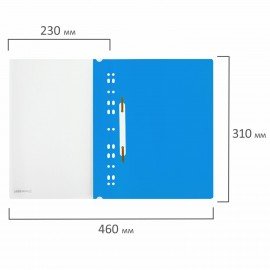 Скоросшиватель изготовлен из качественного полипропилена. Фиксирует до 100 листов формата А4. Толщина пластика верхнего листа составляет 140 мкм, нижнего – 180 мкм. Предельно простой механизм подшивки: металлические усики и пластиковая планка для надежной фиксации документов.