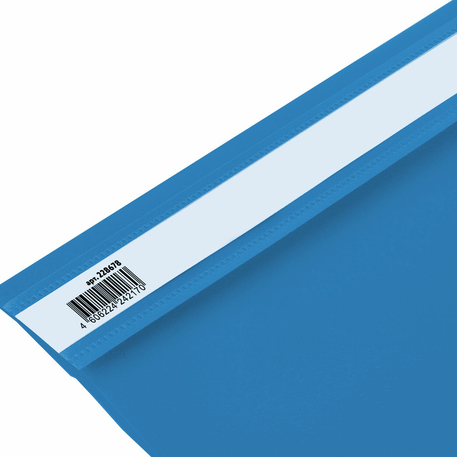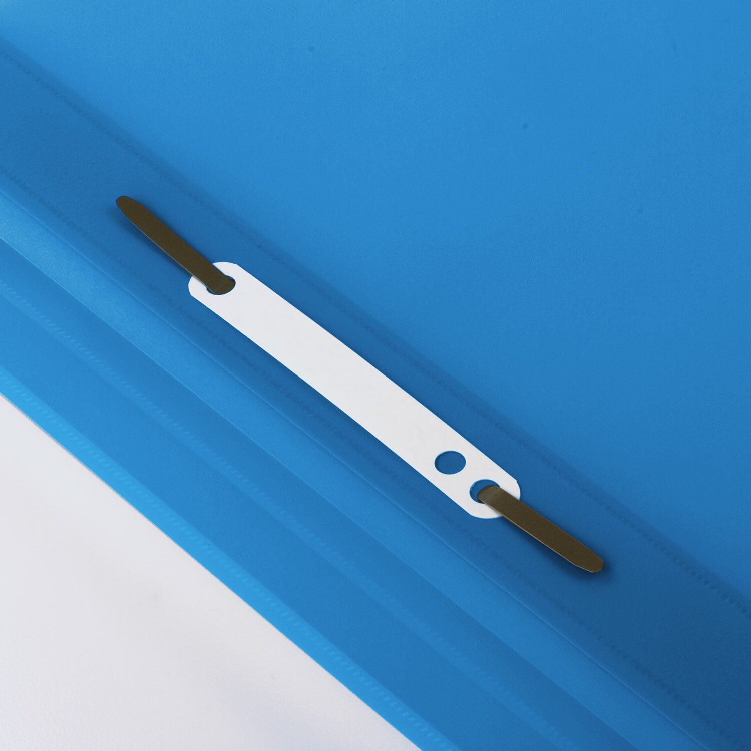 Фиксирует до 100 листов формата А4. Толщина пластика для верхнего листа - 130 мкм, для нижнего - 180 мкм. Предельно простой механизм подшивки: металлические усики и пластиковая планка для надежной фиксации документов. Скоросшиватель изготовлен из полипропилена. Снабжен прозрачным верхним листом. Для идентификации имеет сменный пластиковый корешок. Благодаря фактуре "песок" и яркому голубому цвету обложки важная папка никогда не затеряется на полке.
