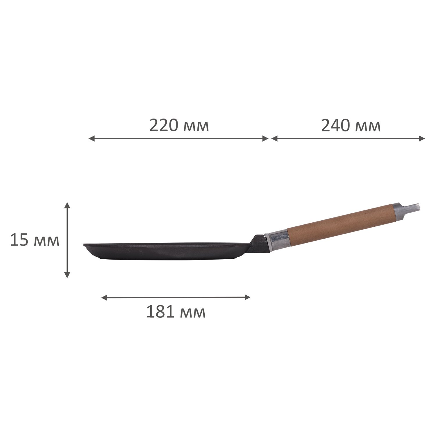 Сковорода из литого чугуна не имеет покрытия. Она "не боится" использования металлических лопаток при готовке и подходит для любой плиты и даже открытого огня. За счет съемной деревянной ручки эту посуду можно использовать в духовом шкафу для выпекания кексов или круглых пирогов. При толщине дна сковороды, составляющем 3,5 мм, тепло распределяется равномерно. Диаметр сковороды – 22 см.