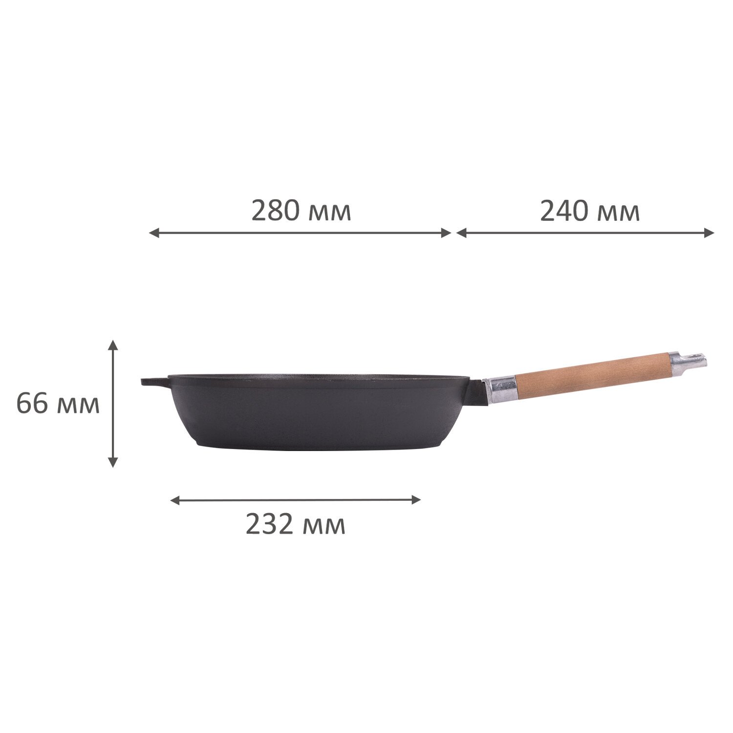 Сковорода из литого чугуна не имеет покрытия. Она "не боится" использования металлических лопаток при готовке и подходит для любой плиты и даже открытого огня. За счет съемной деревянной ручки эту посуду можно использовать в духовом шкафу для выпекания кексов или круглых пирогов. При толщине дна сковороды, составляющем 4 мм, тепло распределяется равномерно. Диаметр сковороды – 28 см.