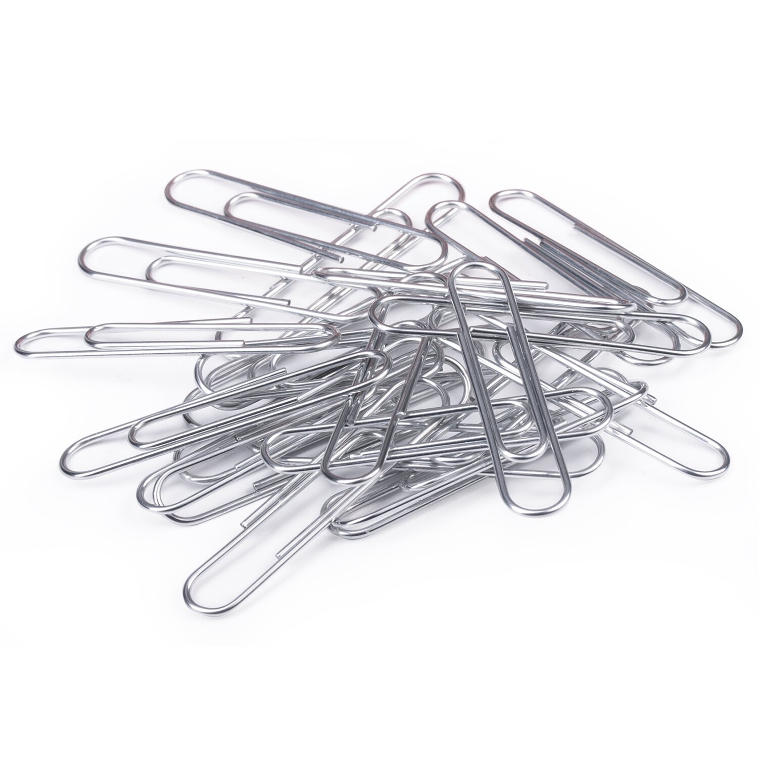 Большие скрепки изготовлены из стали, имеют классическую овальную форму и цинковое покрытие. Длина скрепки составляет 50 мм. Не окисляются и не повреждают документы. 50 штук в картонной коробке.