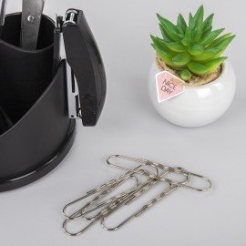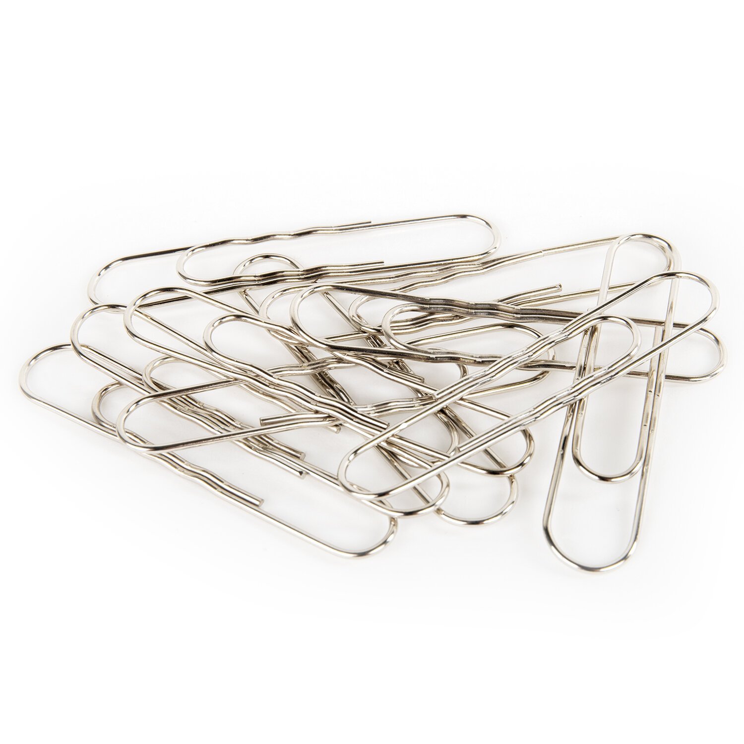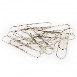 Большие скрепки изготовлены из стали, имеют классическую овальную форму и блестящее никелевое покрытие. Длина скрепки составляет 78 мм. Не окисляются и не повреждают документы. 50 штук в картонной коробке.