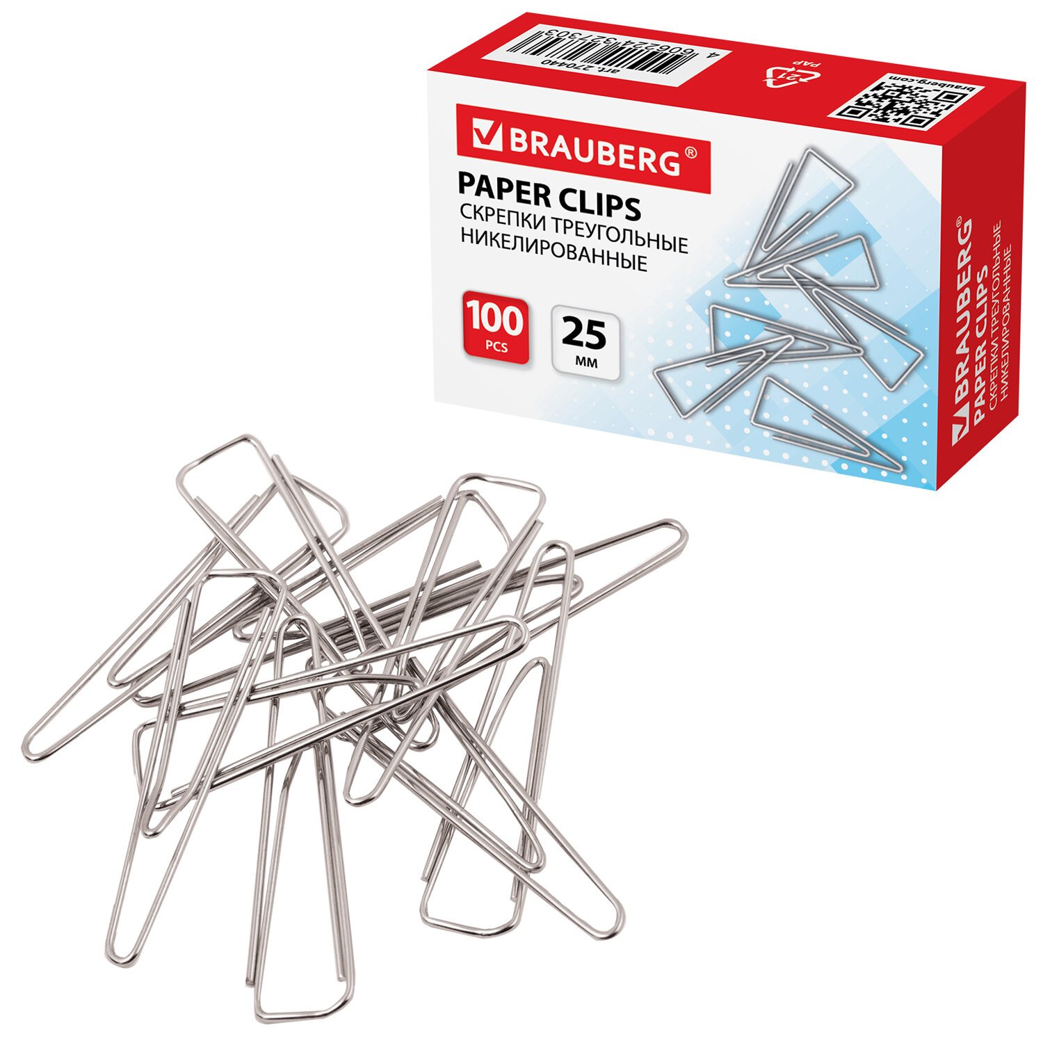 Скрепки BRAUBERG, 25 мм, никелированные, треугольные, 100 шт., в картонной коробке, 270440