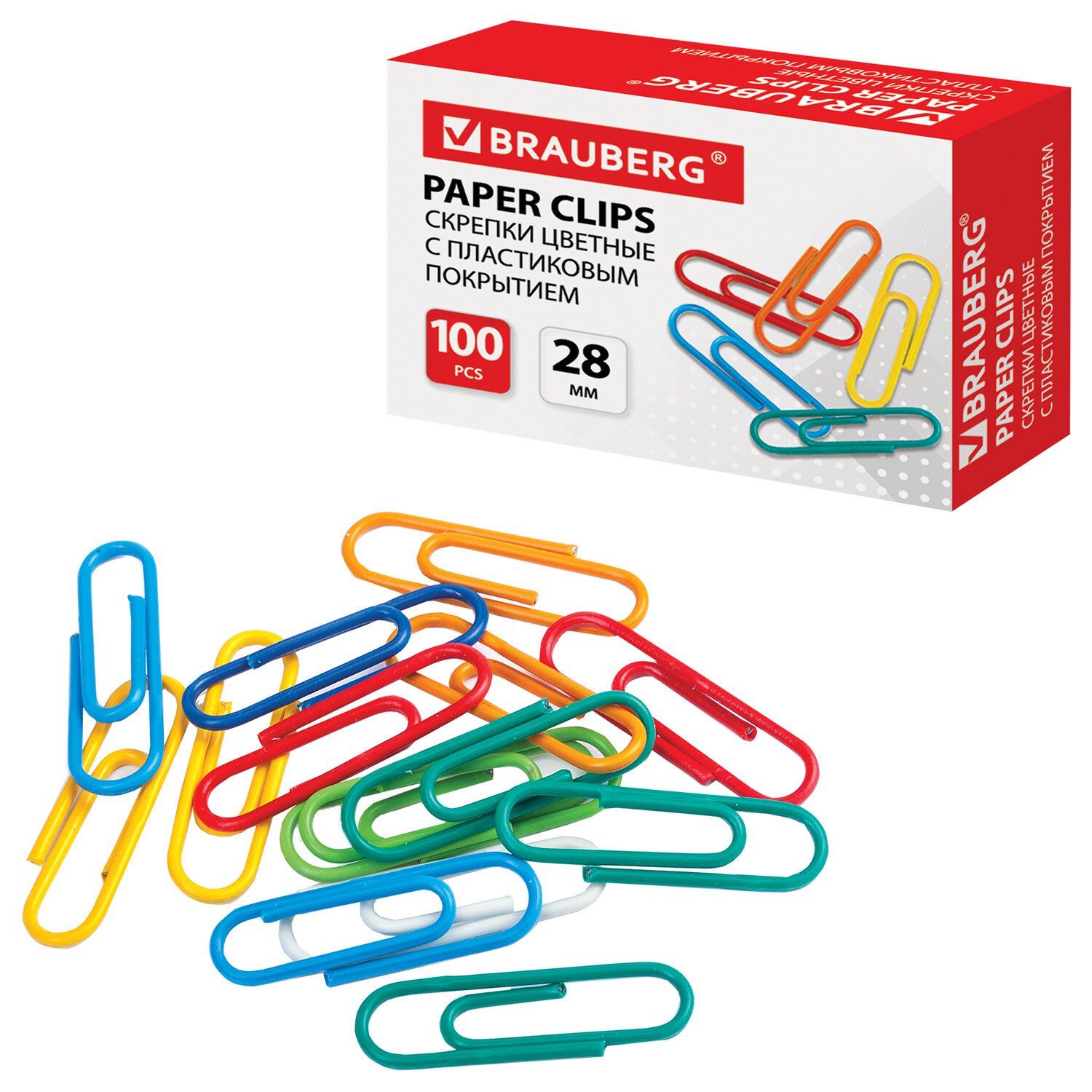 Скрепки BRAUBERG, 28 мм, цветные, 100 шт., в картонной коробке, Россия, 220555
