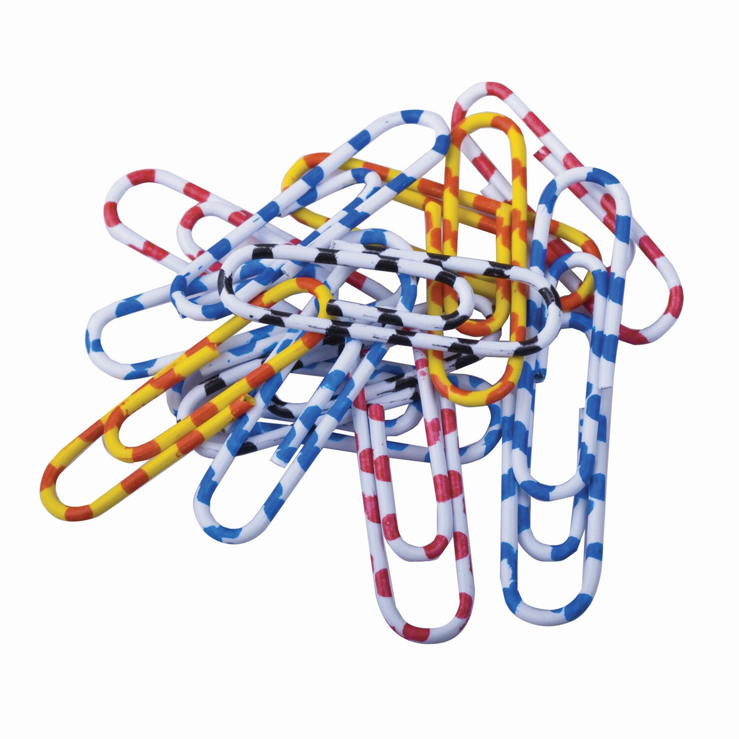 Скрепки изготовлены из стали, имеют классическую овальную форму и цветное пластиковое покрытие в полоску. Длина скрепки составляет 28 мм. Не окисляются и не повреждают документы. 100 штук в картонной коробке.