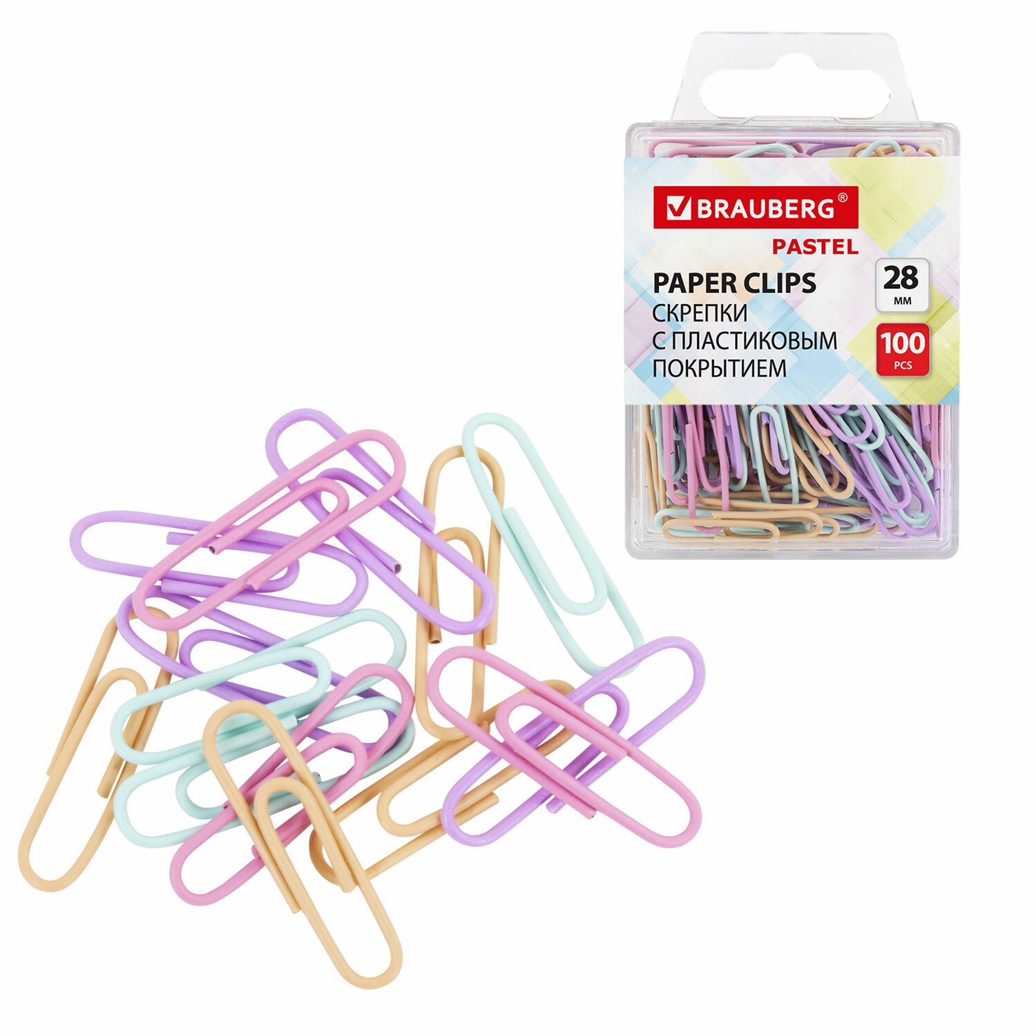 Скрепки BRAUBERG PASTEL, 28 мм, пастельные цвета, 100 шт., в пластиковой коробке, 271956