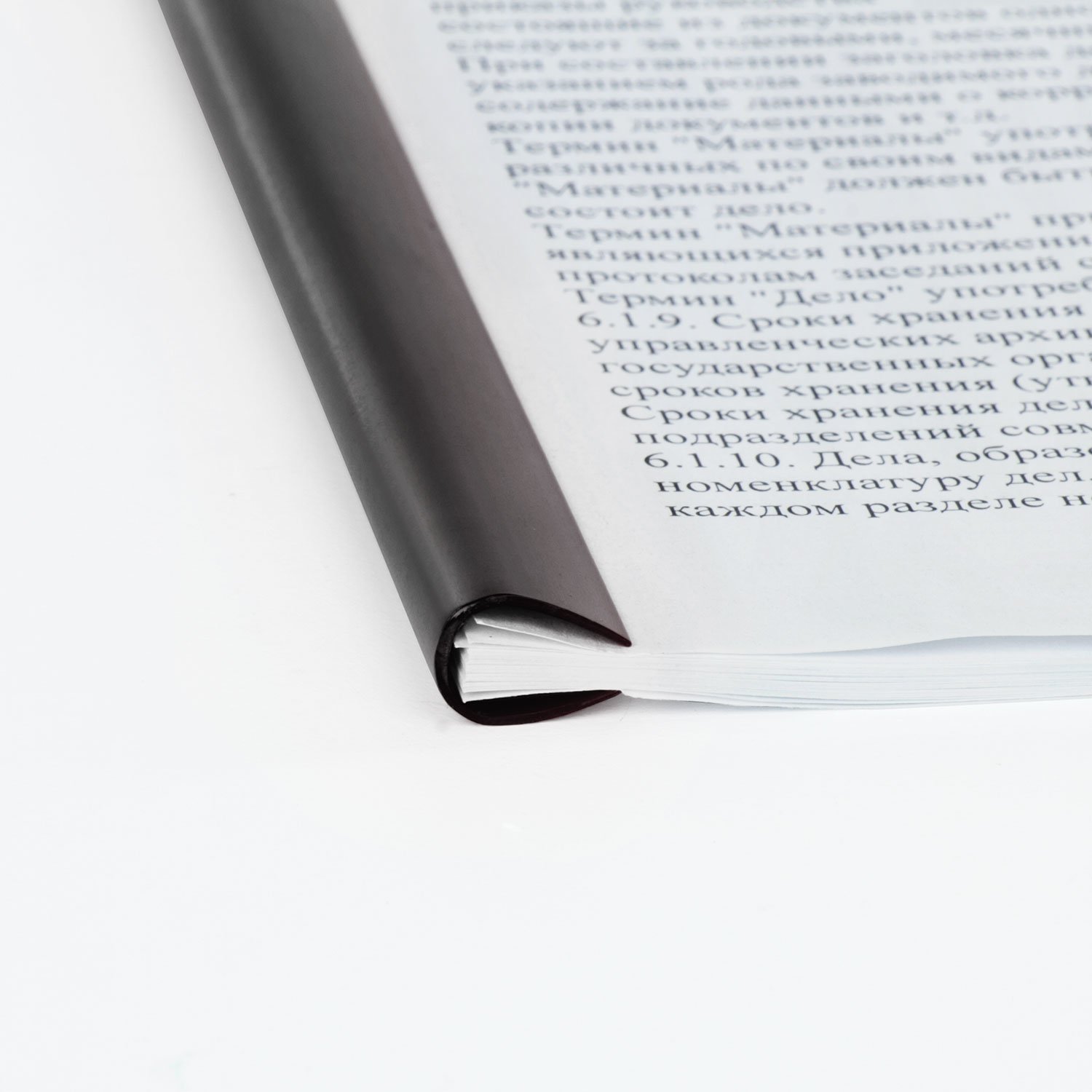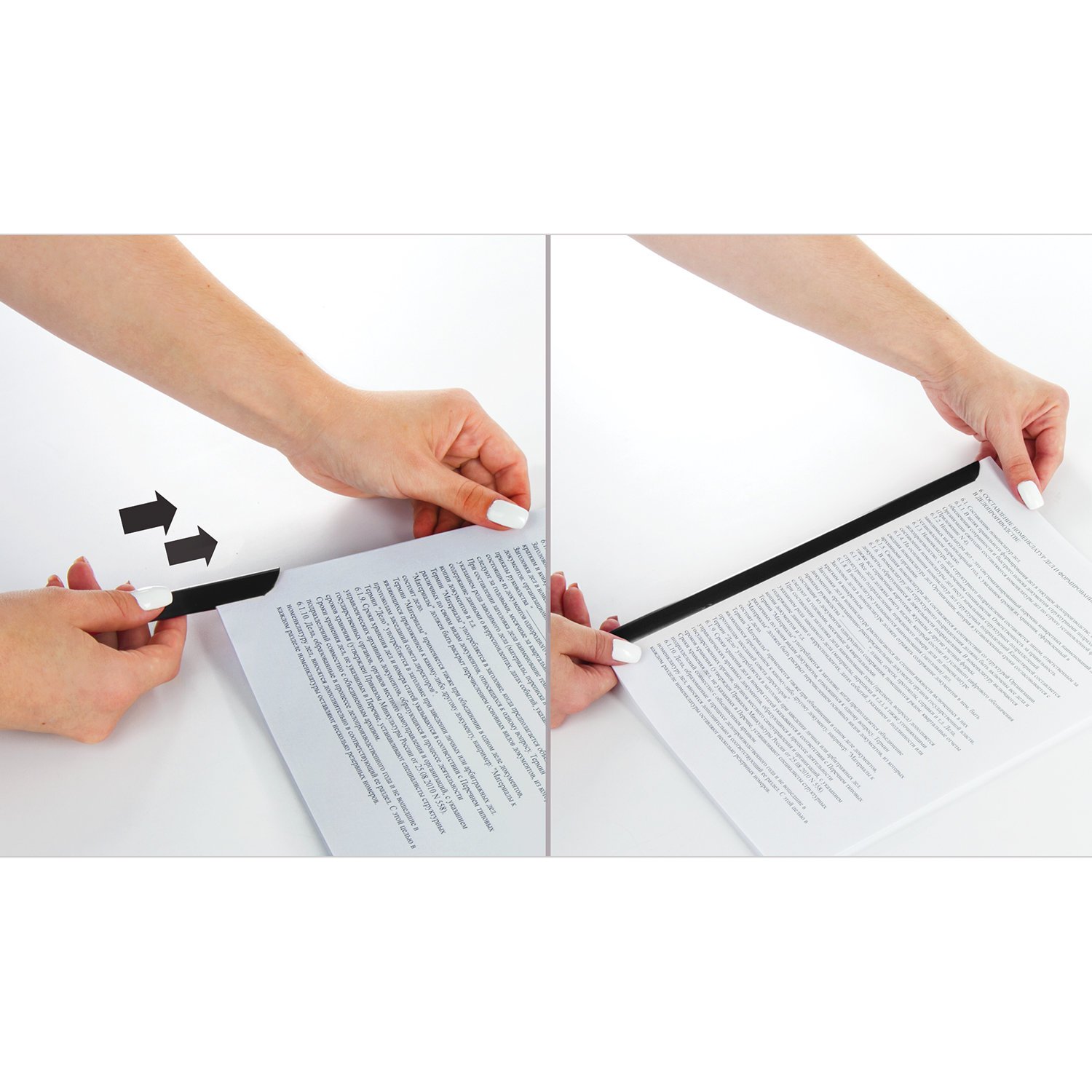 Плотный пластиковый корешок черного цвета надежно скрепляет бумаги. Вмещает до 50 листов. Длина механизма составляет 297 мм, а ширина 10 мм. В комплект входит 10 штук.