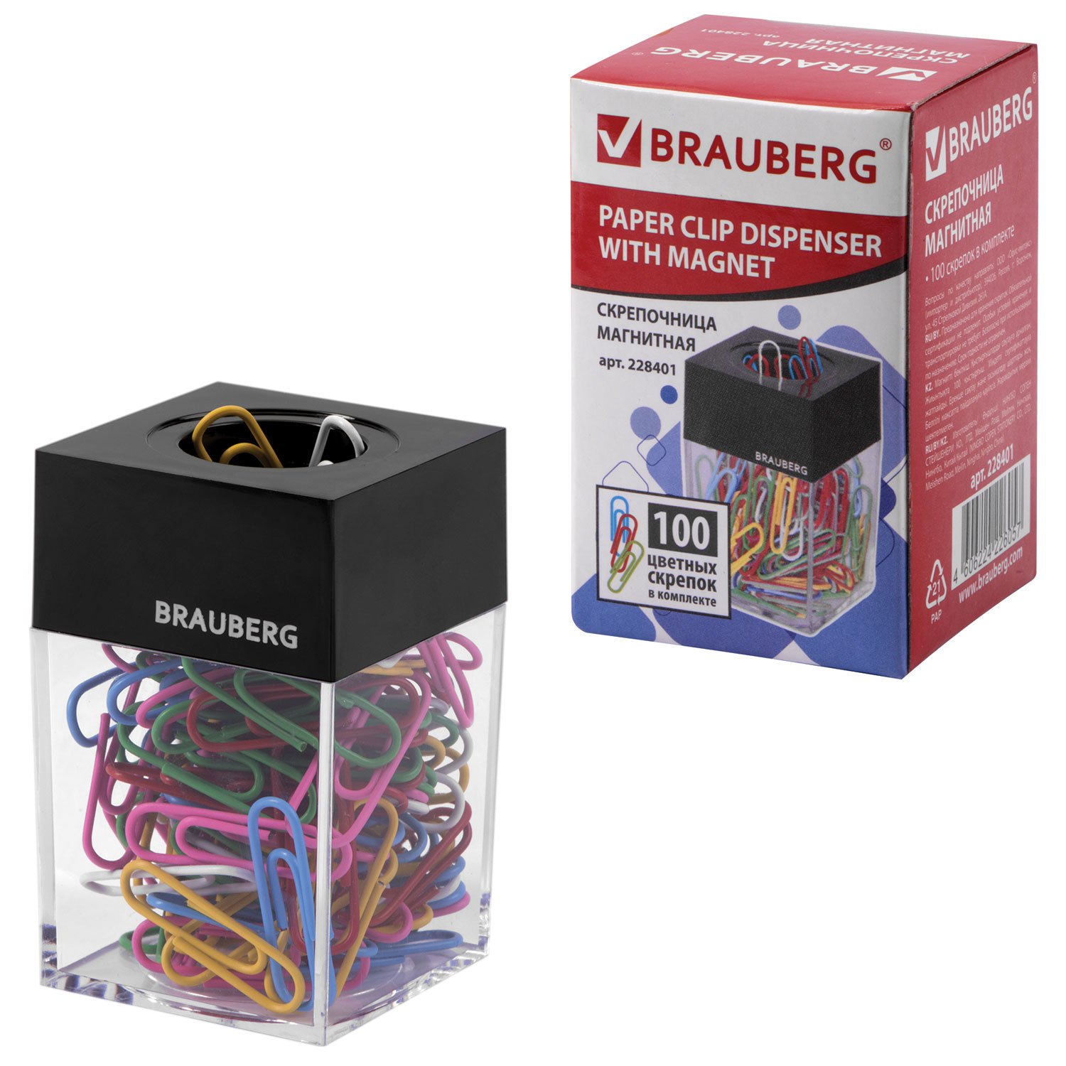 Скрепочница магнитная BRAUBERG со 100 цветными скрепками 28 мм, прозрачный корпус, 228401