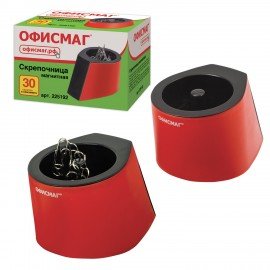Скрепочница магнитная ОФИСМАГ с 30 скрепками, стильный корпус, красно-черная, 225192