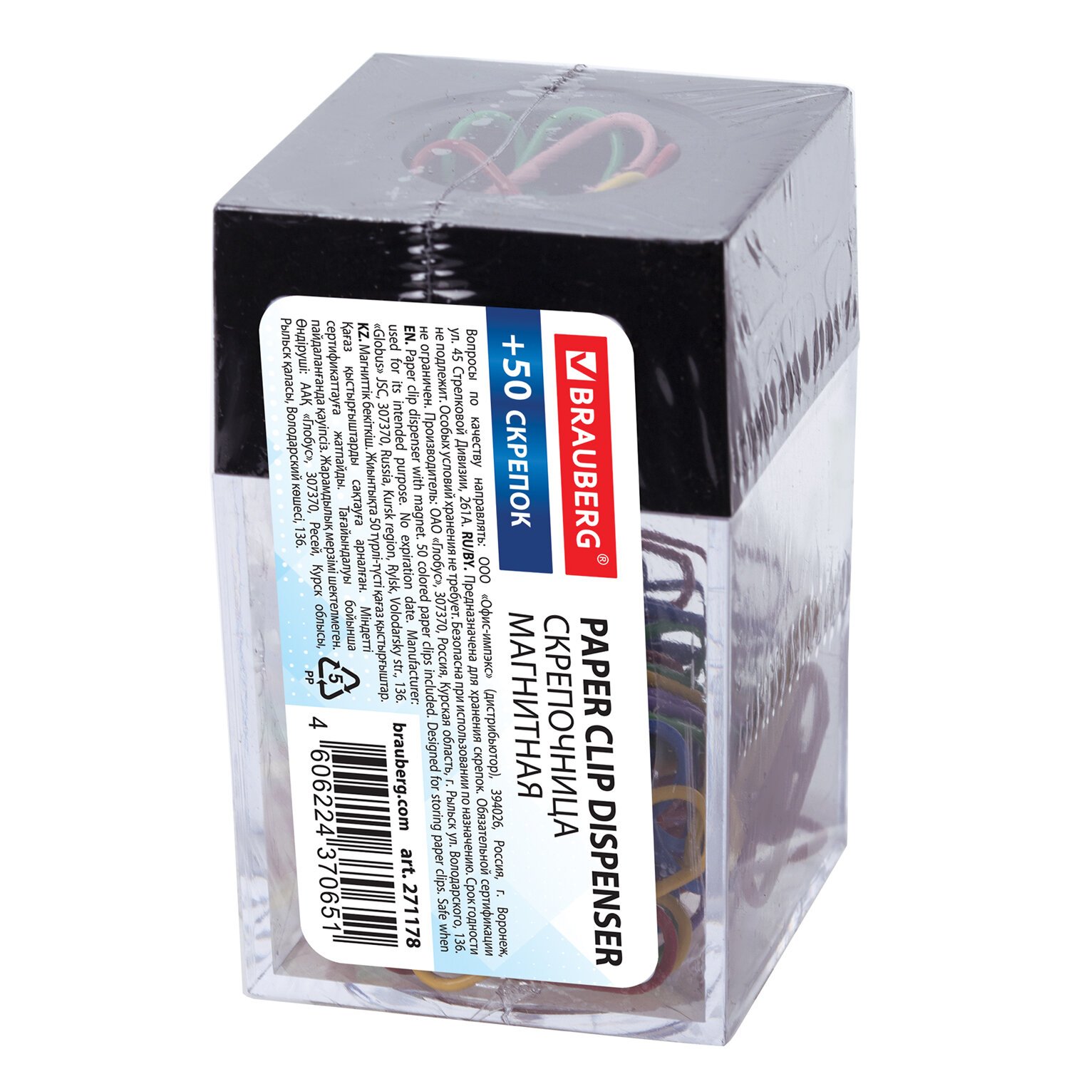 Скрепочница магнитная с 50 цветными скрепками 28 мм, РОССИЯ, BRAUBERG, 271178, ДМ-28П-50