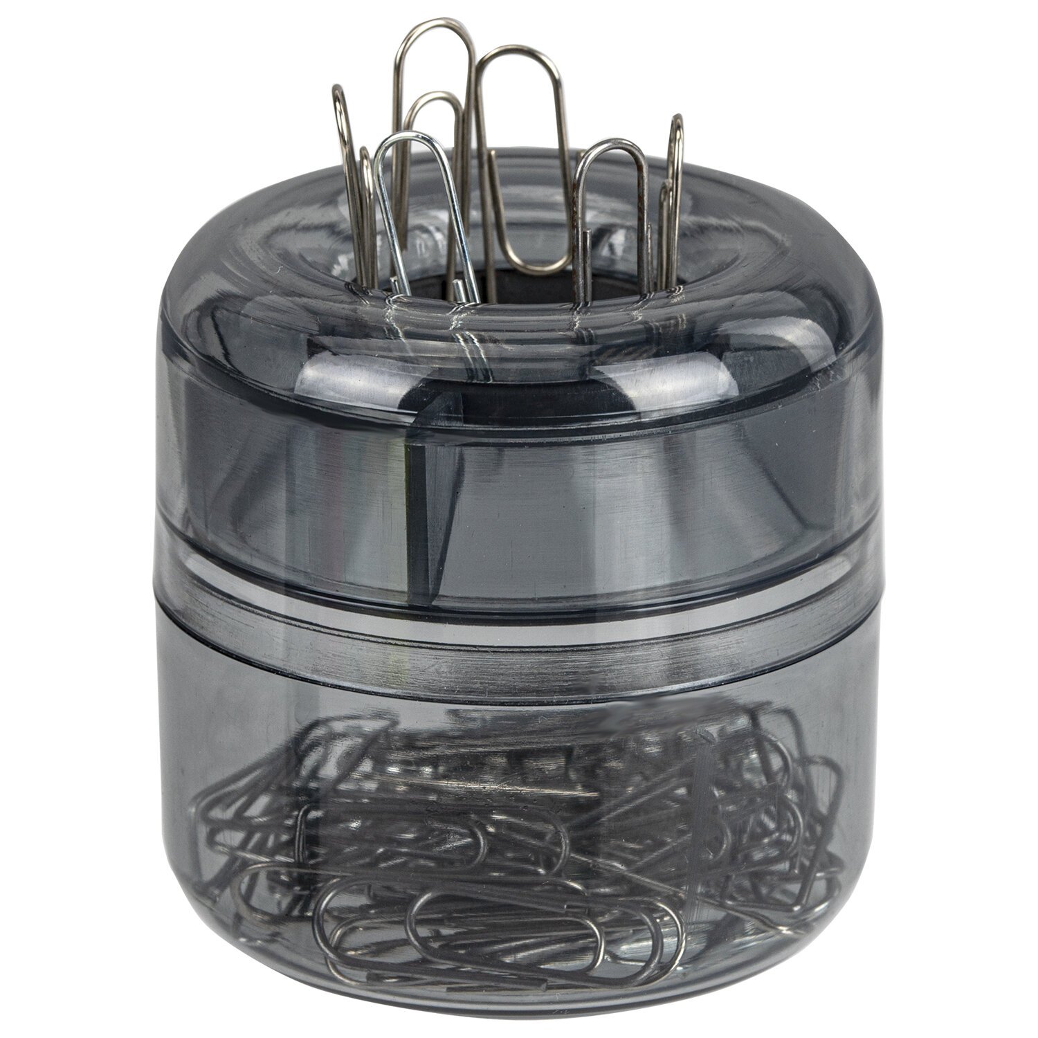 Скрепочница цилиндрической формы выполнена из тонированного пластика. Встроенный магнит предотвращает высыпание скрепок. Размер - 6 x 6 х 6 см.