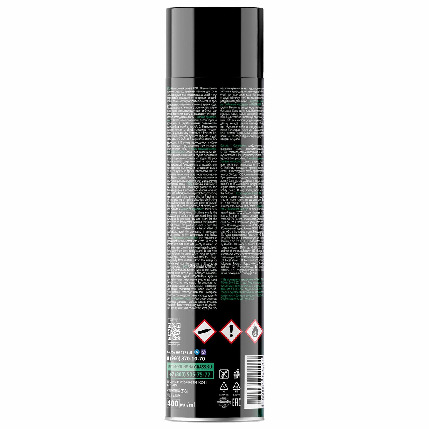 Смазка силиконовая 400 мл GRASS SILICONE, применение в офисе, быту, производстве, аэрозоль, 110206