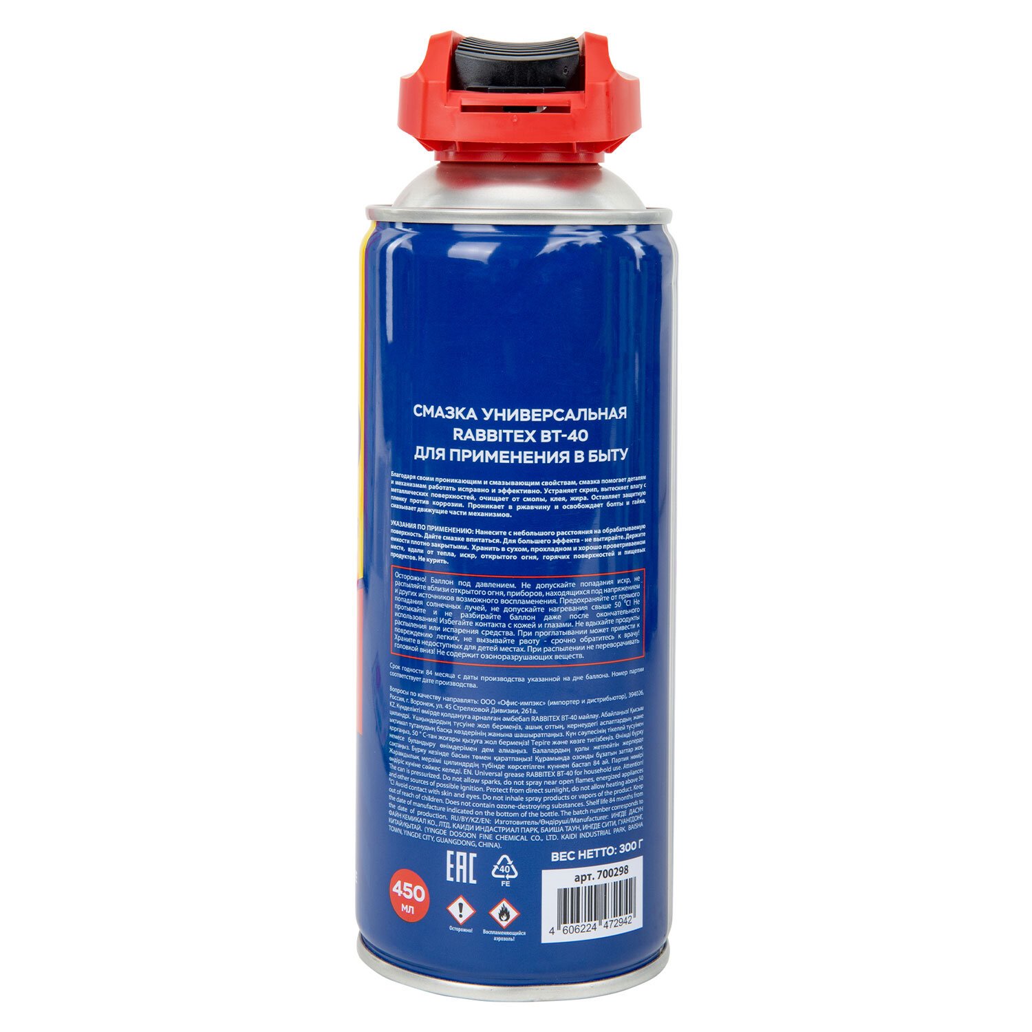Смазка универсальная проникающая BT-40 (аналог WD-40) 450 мл, аэрозоль с трубочкой, RABBITEX, 700297