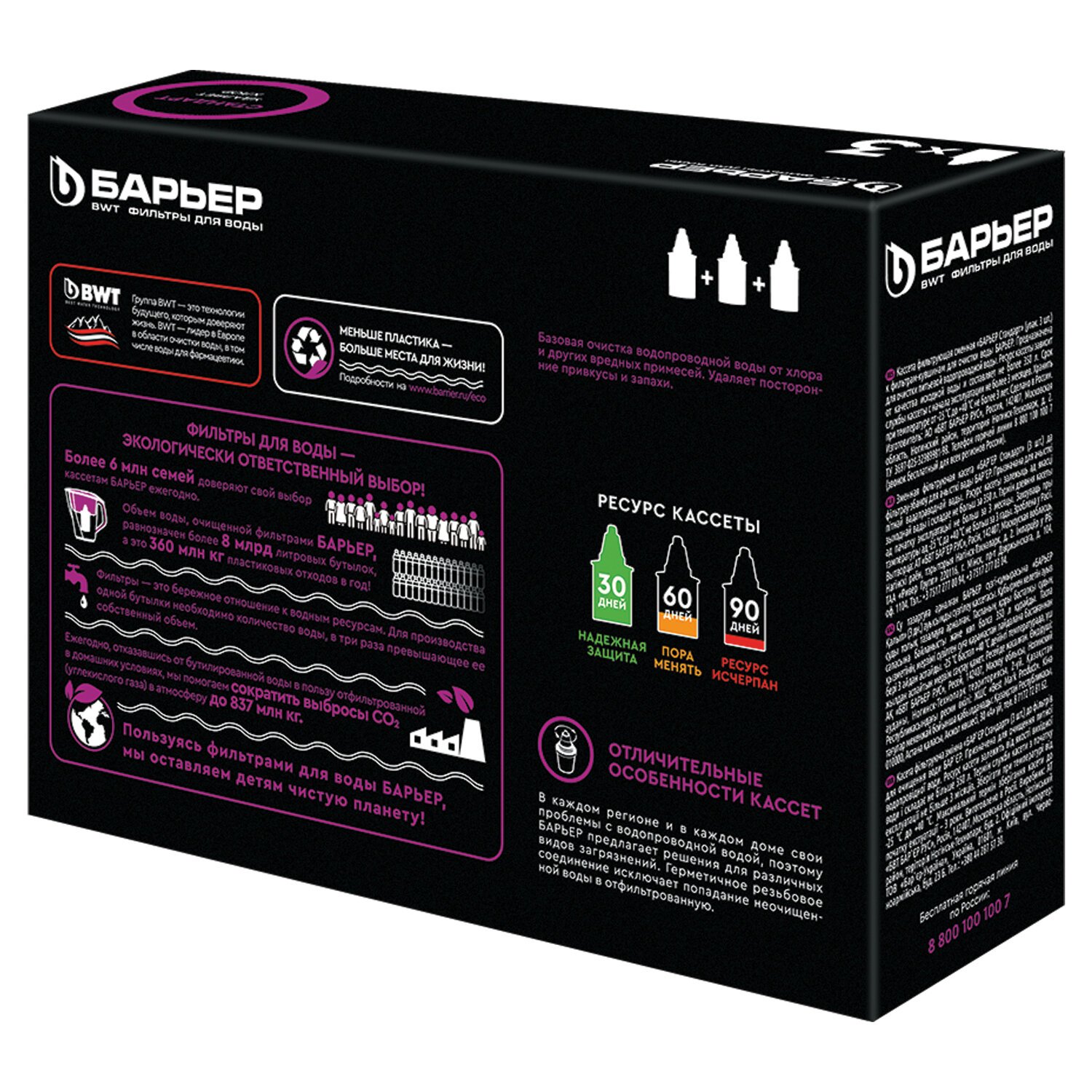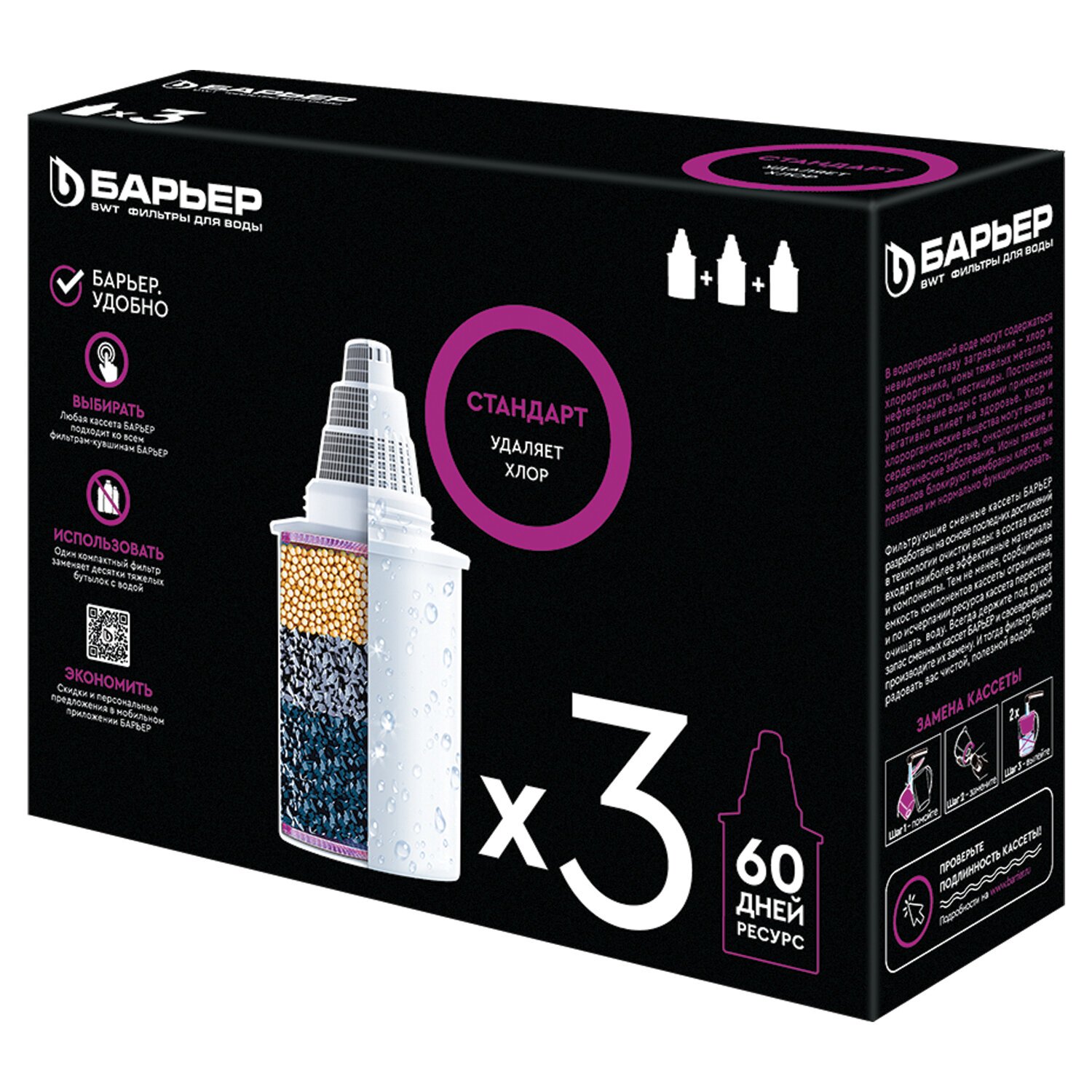 Кассета серии "Стандарт" осуществляет качественную доочистку водопроводной питьевой воды. Эффективно и быстро очистит от токсичных и тяжелых металлов, хлора, хлорорганики, линдана, бензола, фенола, пестицидов, ПАВ и нефтепродуктов. Обладает лёгким умягчительным эффектом. Подходит для всех фильтров-кувшинов БАРЬЕР. Герметичная резьба не позволяет нефильтрованной воде попасть в кувшин, для сменной кассеты использован высококачественный пищевой пластик, допущенный для контакта с питьевой водой, температура очищаемой воды не должна превышать 40 °С.