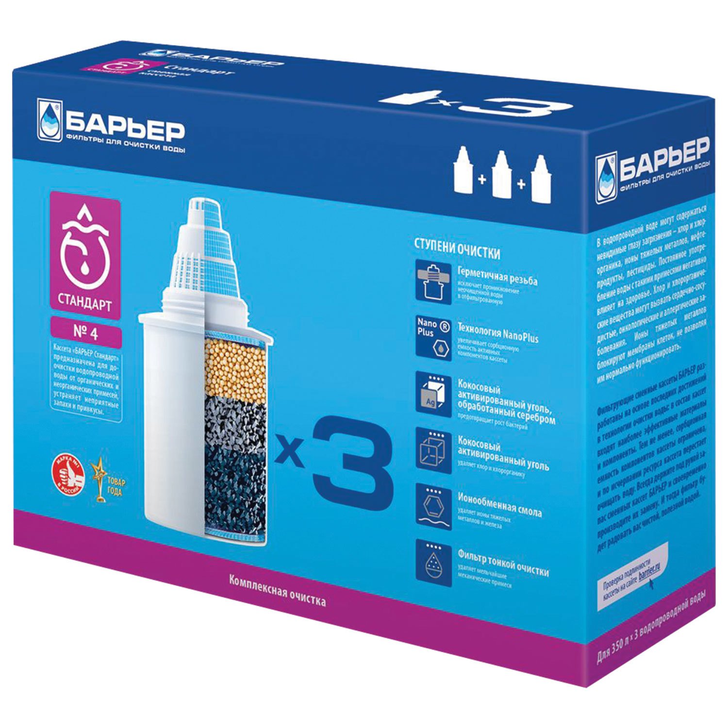 Сменная кассета БАРЬЕР "4 Стандарт", универсальная, для всех типов фильтров БАРЬЕР, комплект 3 шт., К043Р20