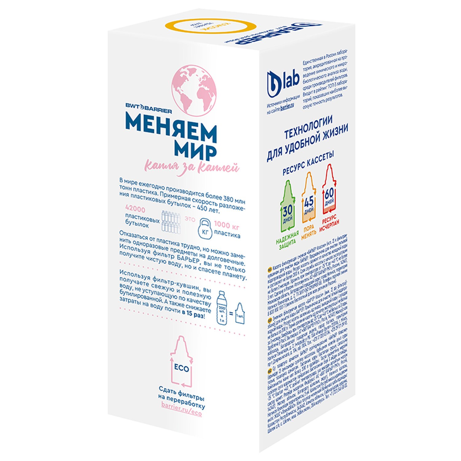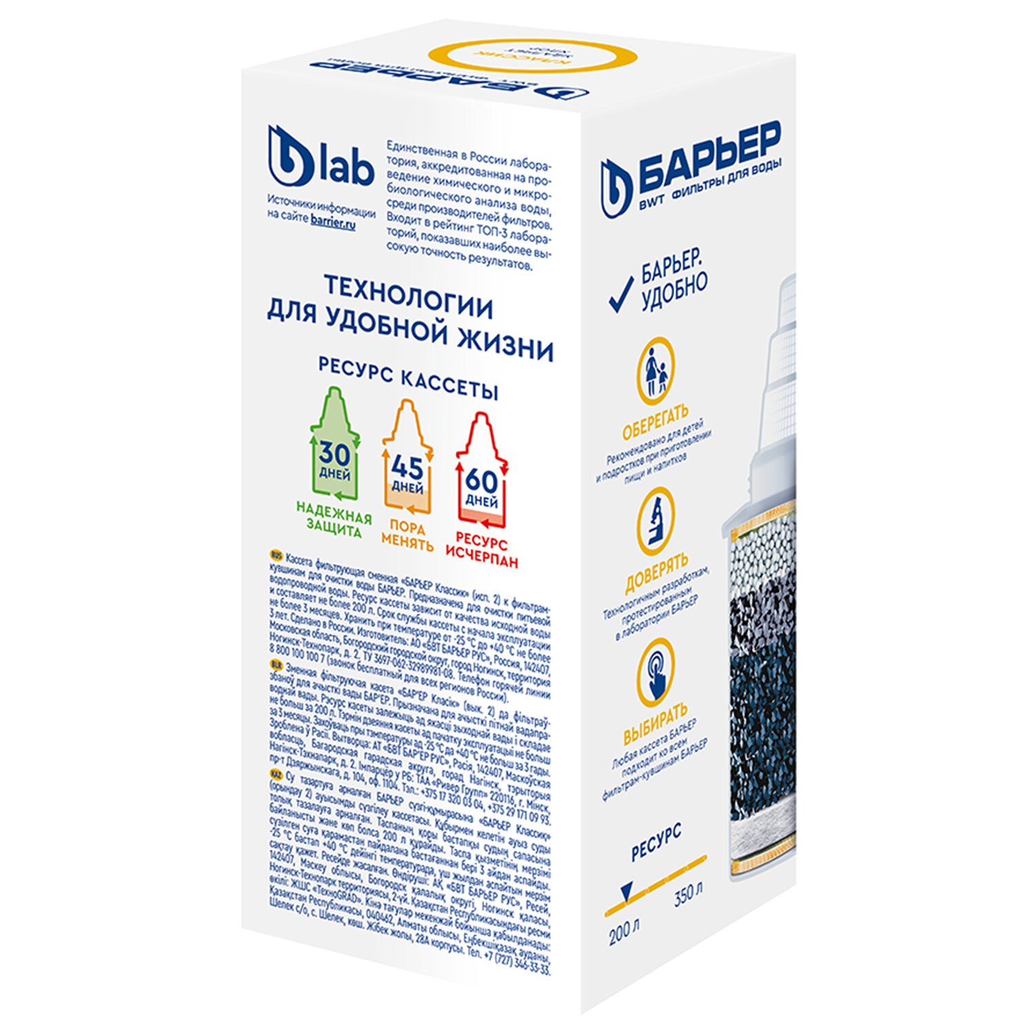 Ресурс кассеты составляет до 200 литров (примерно 45 дней для средней семьи), что делает её практичным выбором для ежедневного использования. Все кассеты БАРЬЕР универсальны: «Классик» подходит ко всем фильтрам-кувшинам бренда, независимо от модели.