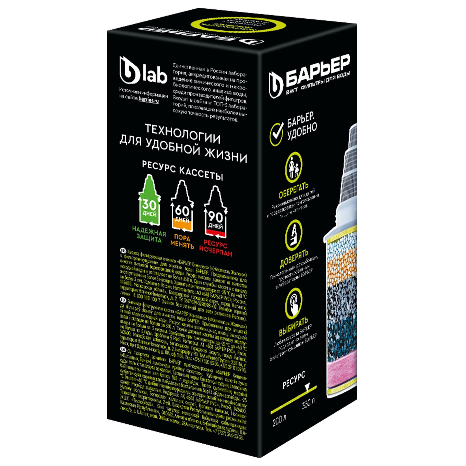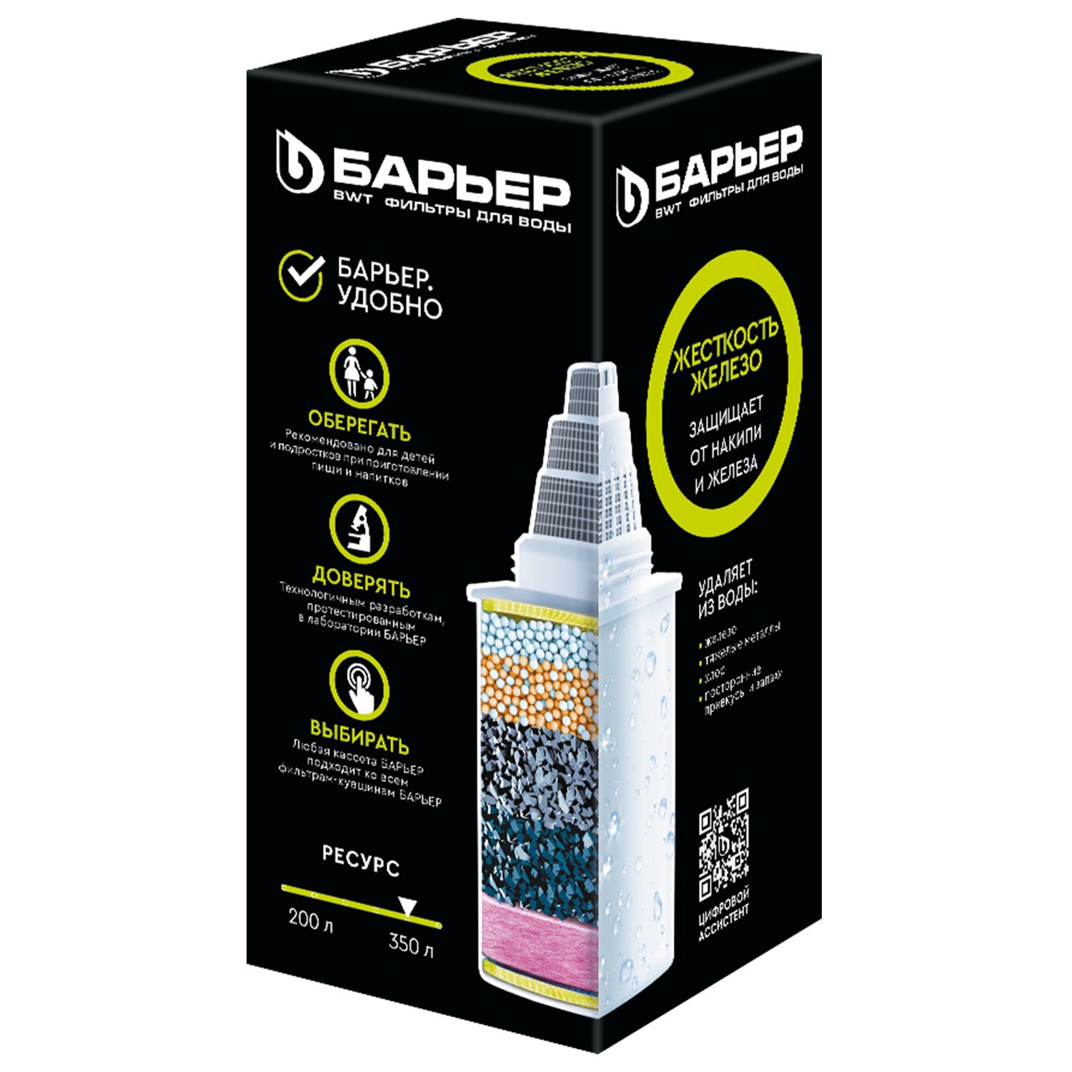 Сменная кассета для фильтра БАРЬЕР Жесткость Железо работает комплексно: снижает жесткость, которую мы привыкли встречать в жизни в виде накипи, удаляет из воды растворенное железо и неприятный металлический привкус, а также, как и все кассеты БАРЬЕР, очищает от хлора, тяжелых металлов и других вредных примесей. Результат – чистая вода без накипи, рыжеватого осадка и неприятного привкуса. Ресурс кассеты — 350 литров.