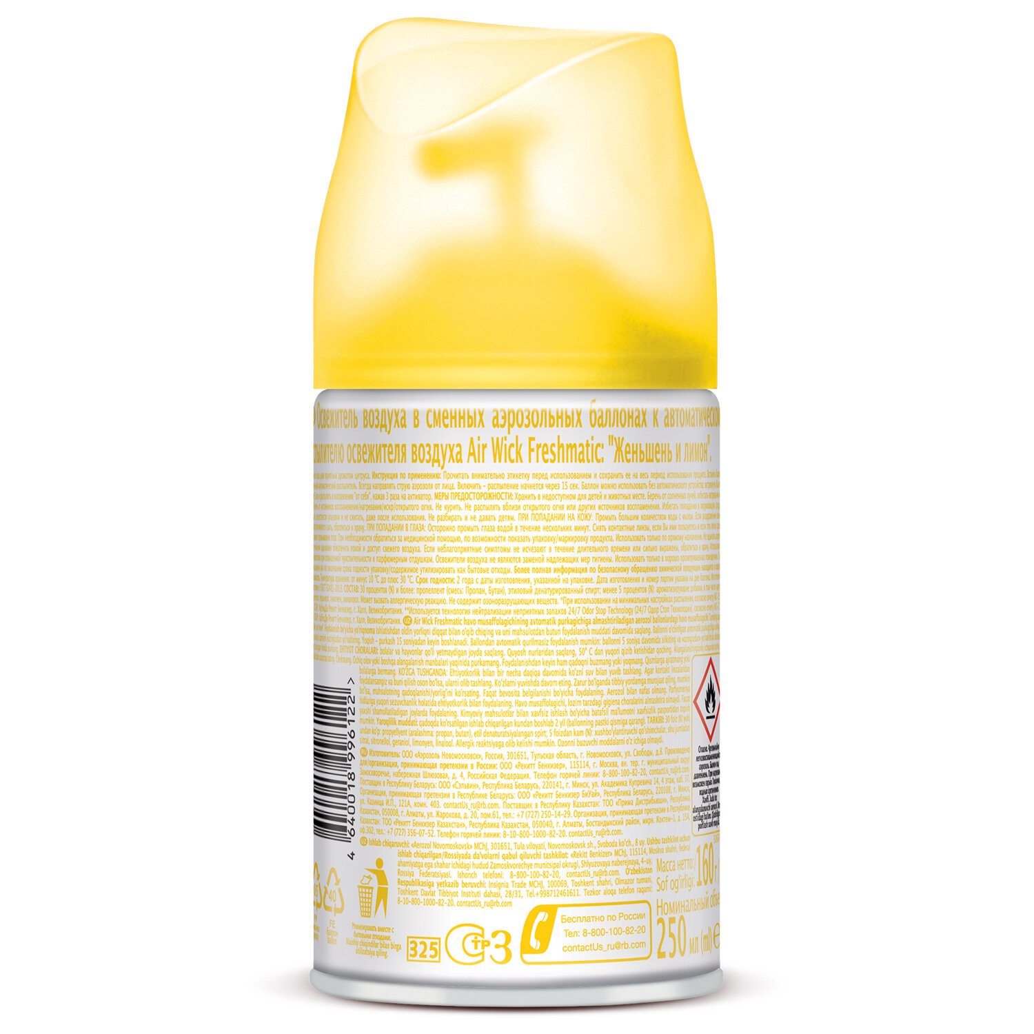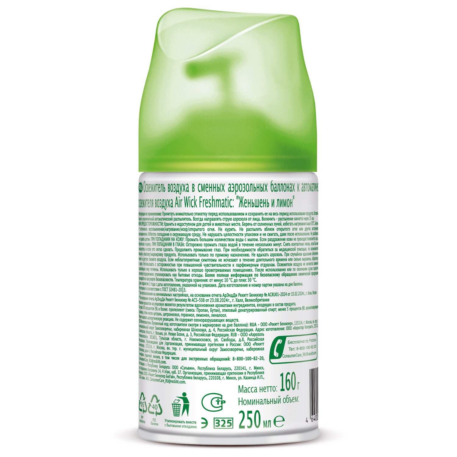 Наслаждайтесь изысканным ароматом женьшеня и лимона вместе с аэрозольным освежителем AIRWICK Freshmatic. "Женьшень и лимон". Сменный баллон освежителя воздуха поможет поддерживать в доме приятный и свежий аромат. Средство прекрасно борется с любыми нежелательными запахами. Его можно устанавливать на кухне, в ванной комнате или туалете. Аэрозоль не оставляет разводов и других следов на занавесках, мебели и других предметах.
