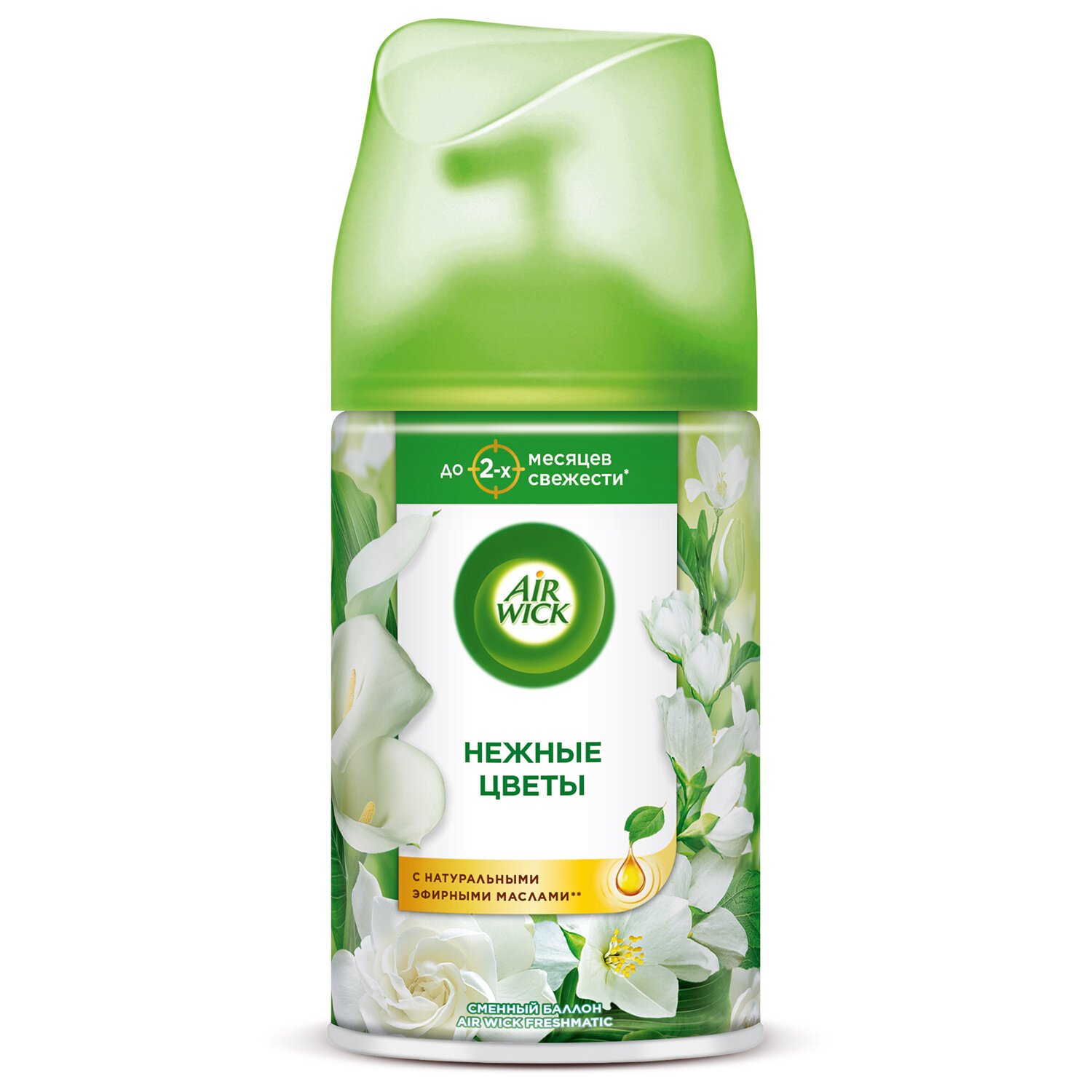 Освежитель воздуха в сменных аэрозольных баллонах к автоматическому распылителю освежителя воздуха AIRWICK Freshmatic "Нежные цветы". Самостоятельно распыляет аромат и эффективно устраняет любые неприятные запахи.